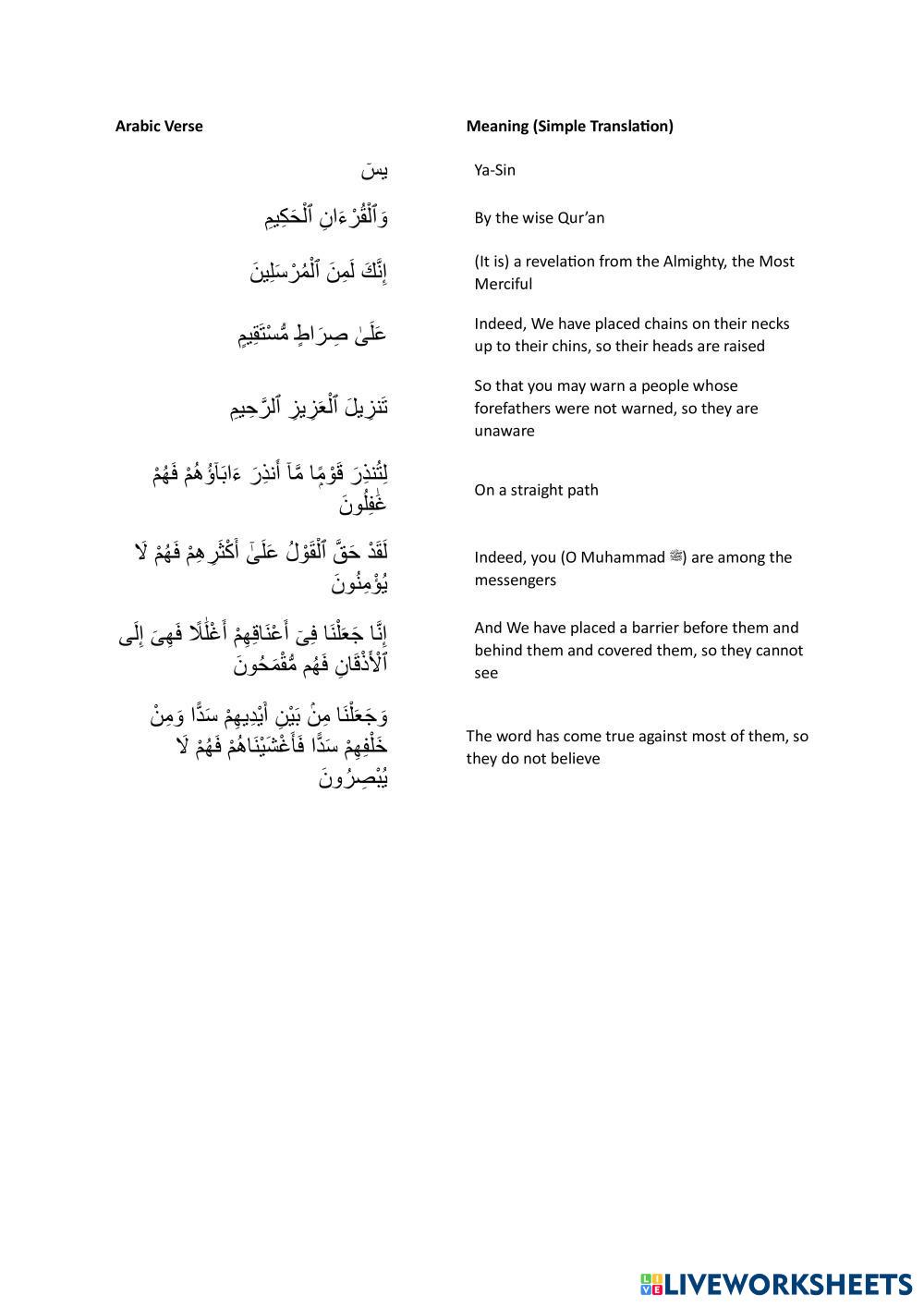 please match Arabic words and Aaya with suitable meaning.