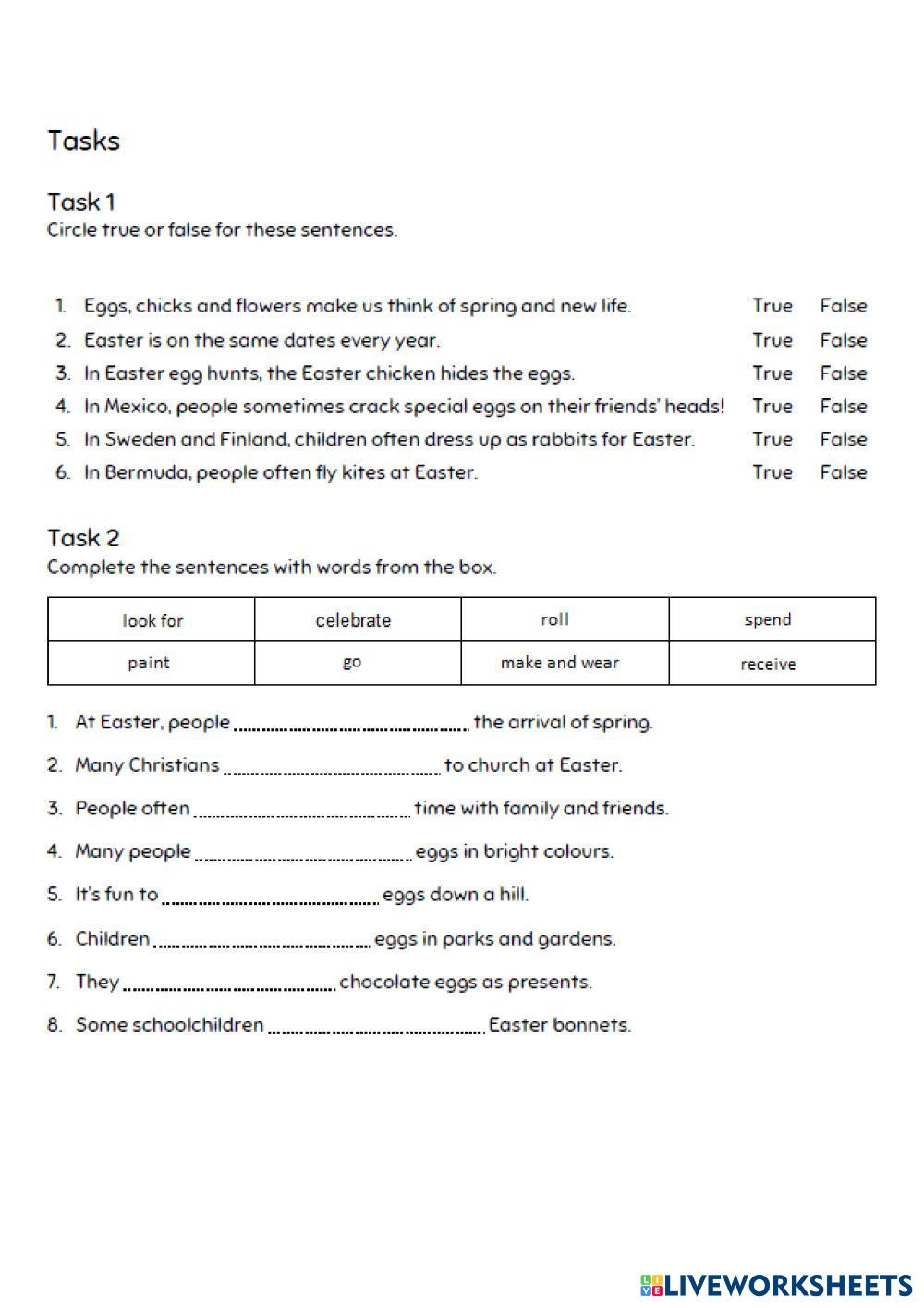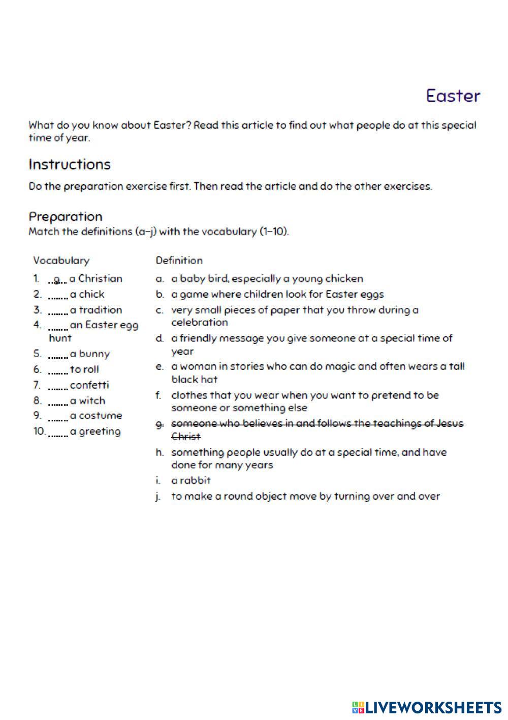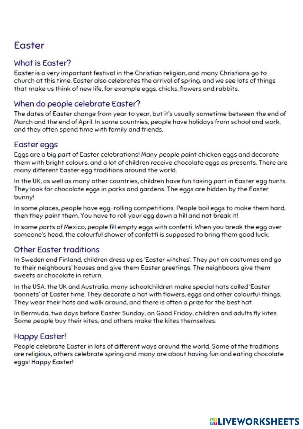 Created by F_Tatiana English Language Middle School 6th grade Reading and Text Analysis English Author's Instructions Do the preparation exercise first. Then read the article and do the other exercises. My Google Classroom Courses × 0 classes selected (0 students total) Quick Access Select all classes (0 classes) All Classes Loading courses... Cancel Share Share to selected Course __COURSE_NAME__ __STUDENT_NAME__ (__STUDENT_EMAIL__) Easter Download Worksheet Validation Check my answers Emails my answers to my teacher Full name Group/level School subject Teacher's email or key code Close Submit Validating worksheet... (12) Your answers have been sent to your teacher. Good luck! OK We encountered an error submitting your answers. Please try again. OK Advertisement | Go Ad Free Created by F_Tatiana English Language Middle School 6th grade Reading and Text Analysis English Author's Instructions Do the preparation exercise first. Then read the article and do the other exercises. Explore Worksheets Activity 1 English Language 6th grade Activity 1 Reading and Text Analysis - English Language READ AND ANSWER THE ITEMS Read English Language 6th grade Read Reading and Text Analysis - English Language Read and answer La leyenda del río escondido English Language 6th grade La leyenda del río escondido Reading and Text Analysis - English Language Comprensión lectora Play script "Six Too Many" English Language 6th grade Play script "Six Too Many" Reading and Text Analysis - English Language Read the Play Script "Six Too Many" and answer the questions