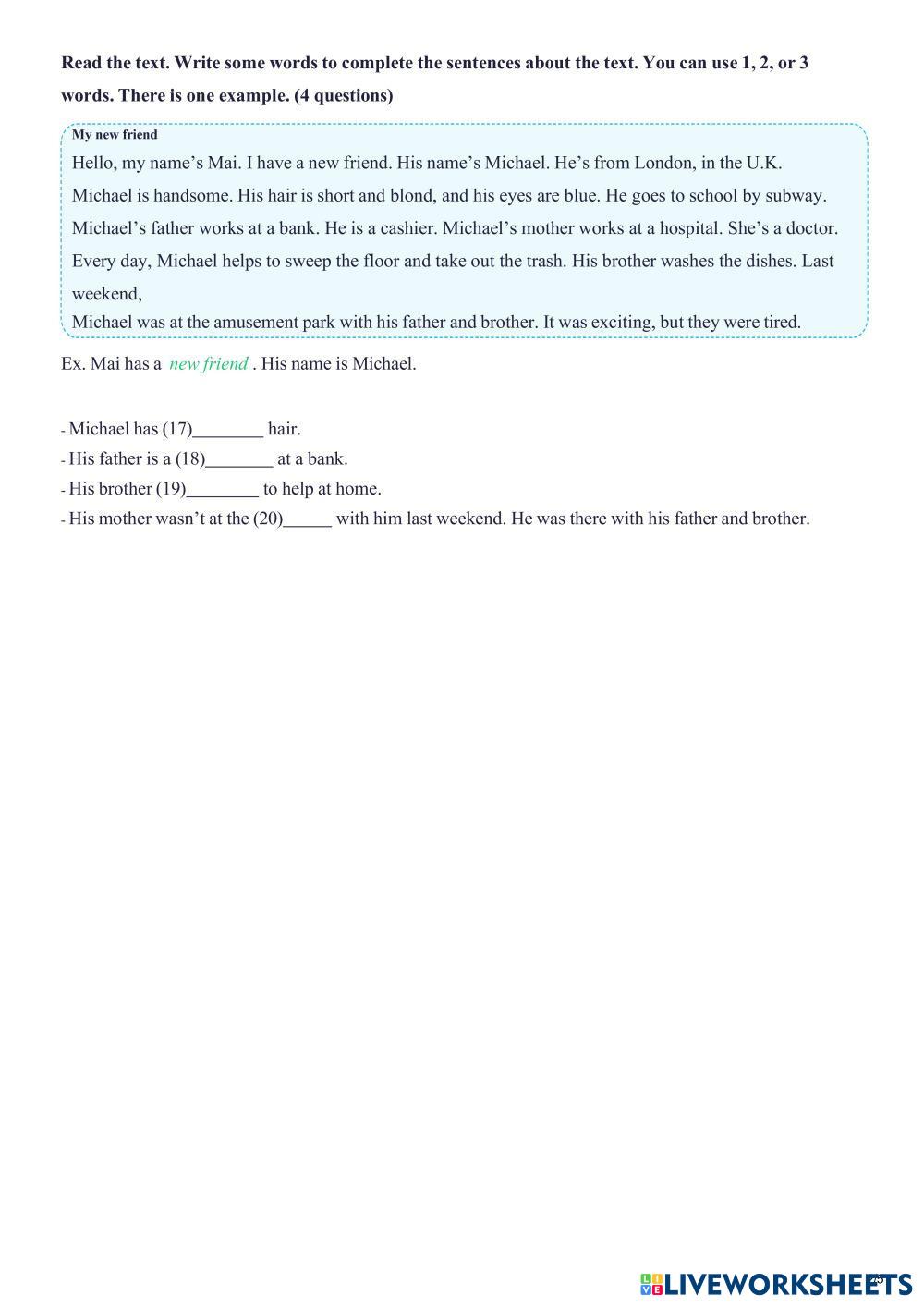 Created byThai Tra English Language Elementary 4th grade Reading Comprehension English Author's Instructions fyi My Google Classroom Courses × 0 classes selected (0 students total) Quick Access Select all classes (0 classes) All Classes Loading courses... Cancel Share Share to selected Course __COURSE_NAME__ __STUDENT_NAME__ (__STUDENT_EMAIL__) ilearn smart art G4 semester 2 Download Worksheet Validation Check my answers Emails my answers to my teacher Full name Group/level School subject Teacher's email or key code Close Submit Validating worksheet... (12) Your answers have been sent to your teacher. Good luck! OK We encountered an error submitting your answers. Please try again. OK Advertisement | Go Ad Free Created byThai Tra English Language Elementary 4th grade Reading Comprehension English Author's Instructions fyi Explore Worksheets نصوص بيرلز الأدبية حياة حسان English Language 4th grade نصوص بيرلز الأدبية حياة حسان Reading Comprehension - English Language نصوص بيرلز الأدبية حياة حسان النصوص العلمية بيرلز الحوت الأزرق English Language 4th grade النصوص العلمية بيرلز الحوت الأزرق Reading Comprehension - English Language النصوص العلمية بيرلز الحوت الأزرق نص بيرلز ميكي ماوس الصحراء English Language 4th grade نص بيرلز ميكي ماوس الصحراء Reading Comprehension - English Language نصوص بيرلز الأدبية نصوص أدبية بيرلز زهور على سطح المنزل English Language 4th grade نصوص أدبية بيرلز زهور على سطح المنزل Reading Comprehension - English Language نصوص أدبية بيرلز زهور على سطح المنزل