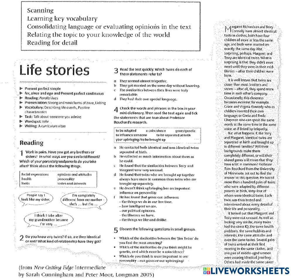 Look at these activities from a coursebook for intermediate level teenagers an young adults and an extract from the reading passage they accompany. Which of the terms about reading in the boxt match which activities?