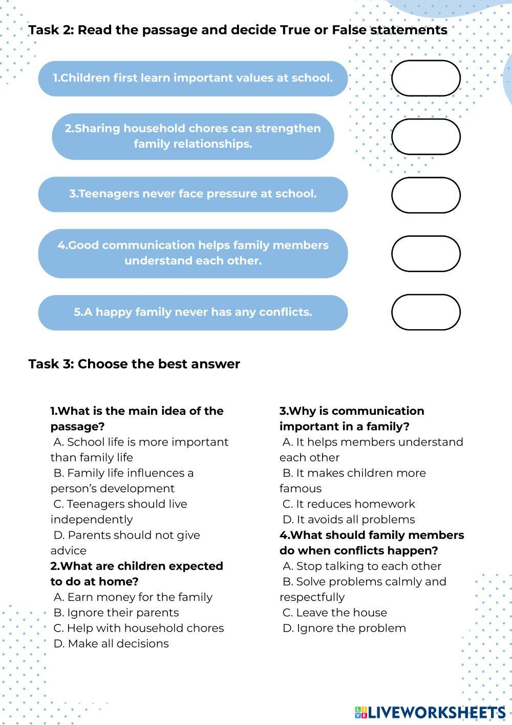 Created by phngn English Language High School 10th grade Reading Comprehension English Author's Instructions Read carefully each task and do the task My Google Classroom Courses × 0 classes selected (0 students total) Quick Access Select all classes (0 classes) All Classes Loading courses... Cancel Share Share to selected Course __COURSE_NAME__ __STUDENT_NAME__ (__STUDENT_EMAIL__) UNIT 1: FAMILY LIFE Download Worksheet Validation Check my answers Emails my answers to my teacher Full name Group/level School subject Teacher's email or key code Close Submit Validating worksheet... (12) Your answers have been sent to your teacher. Good luck! OK We encountered an error submitting your answers. Please try again. OK Advertisement | Go Ad Free Created by phngn English Language High School 10th grade Reading Comprehension English Author's Instructions Read carefully each task and do the task Explore Worksheets UTLT - TA2304 - Reading - Nguyen Ngoc Phuong Thuy English Language 10th grade UTLT - TA2304 - Reading - Nguyen Ngoc Phuong Thuy Reading Comprehension - English Language Read the passage and do the following tasks. Is it goo to be bored? English Language 10th grade Is it goo to be bored? Reading Comprehension - English Language Read the text and answer the questions What is the Internet? English Language 10th grade What is the Internet? Reading Comprehension - English Language Read carefully and then answer the questions about the reading. Signs in English English Language 10th grade Signs in English Reading Comprehension - English Language Read the signs and instructions then match them with the correct meaning.