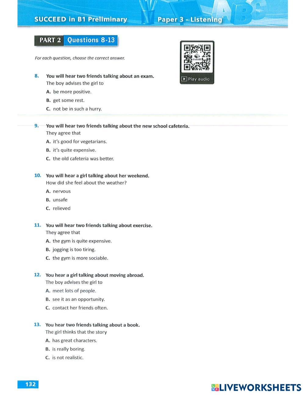 Created by dngdng1 English Language High School 9th grade Reading Comprehension English Author's Instructions nanana My Google Classroom Courses × 0 classes selected (0 students total) Quick Access Select all classes (0 classes) All Classes Loading courses... Cancel Share Share to selected Course __COURSE_NAME__ __STUDENT_NAME__ (__STUDENT_EMAIL__) listening test 8 Download Worksheet Validation Check my answers Emails my answers to my teacher Full name Group/level School subject Teacher's email or key code Close Submit Validating worksheet... (12) Your answers have been sent to your teacher. Good luck! OK We encountered an error submitting your answers. Please try again. OK Advertisement | Go Ad Free Created by dngdng1 English Language High School 9th grade Reading Comprehension English Author's Instructions nanana Explore Worksheets Worksheet 5 - Grade 9 English Language 9th grade Worksheet 5 - Grade 9 Reading Comprehension - English Language Bác Huyền Reading Comprehension English Language 9th grade Reading Comprehension Reading Comprehension - English Language READ THE TEXT AND SOLVE THE ACTIVITIES Online_Viet Teacher_S9_W29_U9_Grammar 1 English Language 9th grade Online_Viet Teacher_S9_W29_U9_Grammar 1 Reading Comprehension - English Language Online_Viet Teacher_S9_W29_U9_Grammar 1 Video Games A1 reading English Language 9th grade Video Games A1 reading Reading Comprehension - English Language Read the text and answer the questions.