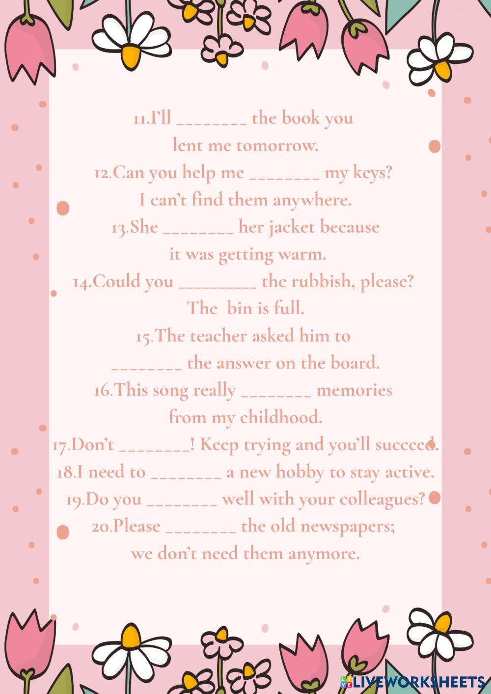 Fill in with the following verbs:put on, take off, turn on, turn off, break down, break up, bring back, get up, get along, give back, give up, go on, hang out, look after, look for, pick up, run out, take out, throw away, work out