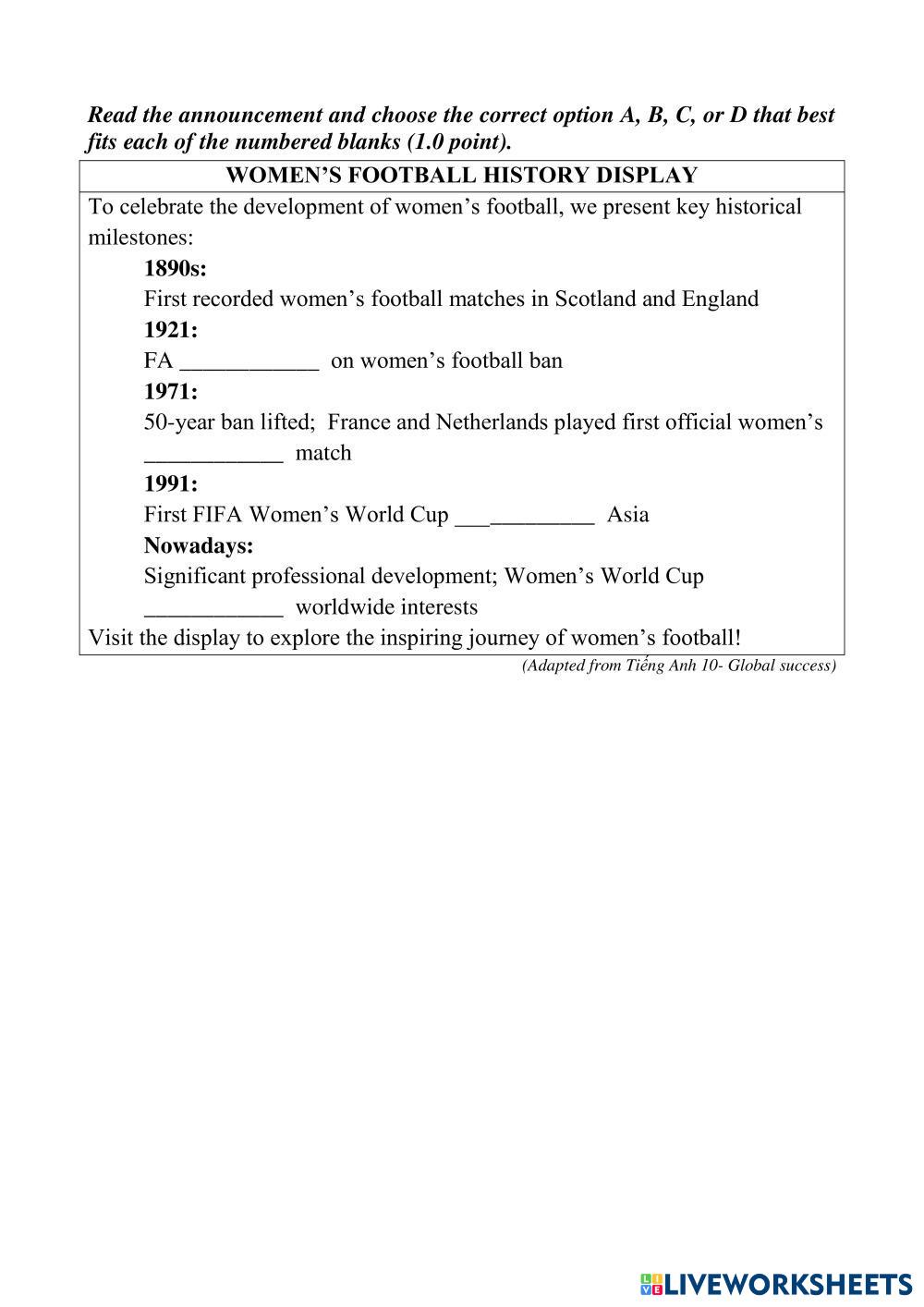 Created by longnguyen English Language High School 10th grade Reading Comprehension English Author's Instructions Read My Google Classroom Courses × 0 classes selected (0 students total) Quick Access Select all classes (0 classes) All Classes Loading courses... Cancel Share Share to selected Course __COURSE_NAME__ __STUDENT_NAME__ (__STUDENT_EMAIL__) Cloze Test Download Worksheet Validation Check my answers Emails my answers to my teacher Full name Group/level School subject Teacher's email or key code Close Submit Validating worksheet... (12) Your answers have been sent to your teacher. Good luck! OK We encountered an error submitting your answers. Please try again. OK Advertisement | Go Ad Free Created by longnguyen English Language High School 10th grade Reading Comprehension English Author's Instructions Read Explore Worksheets Present Simple English Language 10th grade Present Simple Reading Comprehension - English Language Complete these exercises using present simple tense. Dự đoán tuyển sinh vào 10 - 2026 English Language 10th grade Dự đoán tuyển sinh vào 10 - 2026 Reading Comprehension - English Language Đề 12 Dự đoán tuyển sinh vào 10 - 2026 English Language 10th grade Dự đoán tuyển sinh vào 10 - 2026 Reading Comprehension - English Language Đề 11 Dự đoán tuyển sinh vào 10 - 2026 English Language 10th grade Dự đoán tuyển sinh vào 10 - 2026 Reading Comprehension - English Language Đề 10