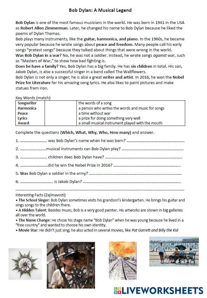 Created by wayra82 English Language Elementary 5th grade Reading Comprehension English Author's Instructions Read a story about Bob Dylan and complete the worksheet. My Google Classroom Courses × 0 classes selected (0 students total) Quick Access Select all classes (0 classes) All Classes Loading courses... Cancel Share Share to selected Course __COURSE_NAME__ __STUDENT_NAME__ (__STUDENT_EMAIL__) Bob Dylan Download Worksheet Validation Check my answers Emails my answers to my teacher Full name Group/level School subject Teacher's email or key code Close Submit Validating worksheet... (12) Your answers have been sent to your teacher. Good luck! OK We encountered an error submitting your answers. Please try again. OK Advertisement | Go Ad Free Created by wayra82 English Language Elementary 5th grade Reading Comprehension English Author's Instructions Read a story about Bob Dylan and complete the worksheet. Explore Worksheets 4.5 English Language 5th grade 4.5 Reading Comprehension - English Language favourite websites SHADOW PUPPET THEATRE English Language 5th grade SHADOW PUPPET THEATRE Reading Comprehension - English Language READ AND COMPLETE THE EXERCISE Aprende literatura English Language 5th grade Aprende literatura Reading Comprehension - English Language A través del bichito lector nos sumergiremos en el maravilloso mundo de la literatura, indagando sus misterios más profundos EXAMEN DE LENGUAJES English Language 5th grade EXAMEN DE LENGUAJES Reading Comprehension - English Language LEE DETENIDAMENTE Y CONTESTA.PUEDES RETOMAR TU GUIA DE ESTUDIO DEL SEGUNDO TRIMESTRE,VERAS QUE FACIL ESTÁ.