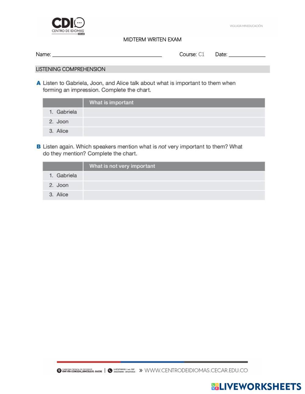 Created byDaniel Woo English Language High School 12th grade Reading Comprehension English Author's Instructions . My Google Classroom Courses × 0 classes selected (0 students total) Quick Access Select all classes (0 classes) All Classes Loading courses... Cancel Share Share to selected Course __COURSE_NAME__ __STUDENT_NAME__ (__STUDENT_EMAIL__) Midterm Exam Sebastian Camargo Download Worksheet Validation Check my answers Emails my answers to my teacher Full name Group/level School subject Teacher's email or key code Close Submit Validating worksheet... (12) Your answers have been sent to your teacher. Good luck! OK We encountered an error submitting your answers. Please try again. OK Advertisement | Go Ad Free Created byDaniel Woo English Language High School 12th grade Reading Comprehension English Author's Instructions . Explore Worksheets Punch the Baby Monkey English Language 12th grade Punch the Baby Monkey Reading Comprehension - English Language Do all the activities about the reader Practical Work Speakout Advanced unit 1 & 2 English Language 12th grade Practical Work Speakout Advanced unit 1 & 2 Reading Comprehension - English Language Read the instructions and complete the activities IELTS 18 GENERAL TEST 2 READING English Language 12th grade IELTS 18 GENERAL TEST 2 READING Reading Comprehension - English Language IELTS TRAINING READING TEST 2 Reading Quiz 1 Int 1 English Language 12th grade Reading Quiz 1 Int 1 Reading Comprehension - English Language complete the requested activities by following the instructions