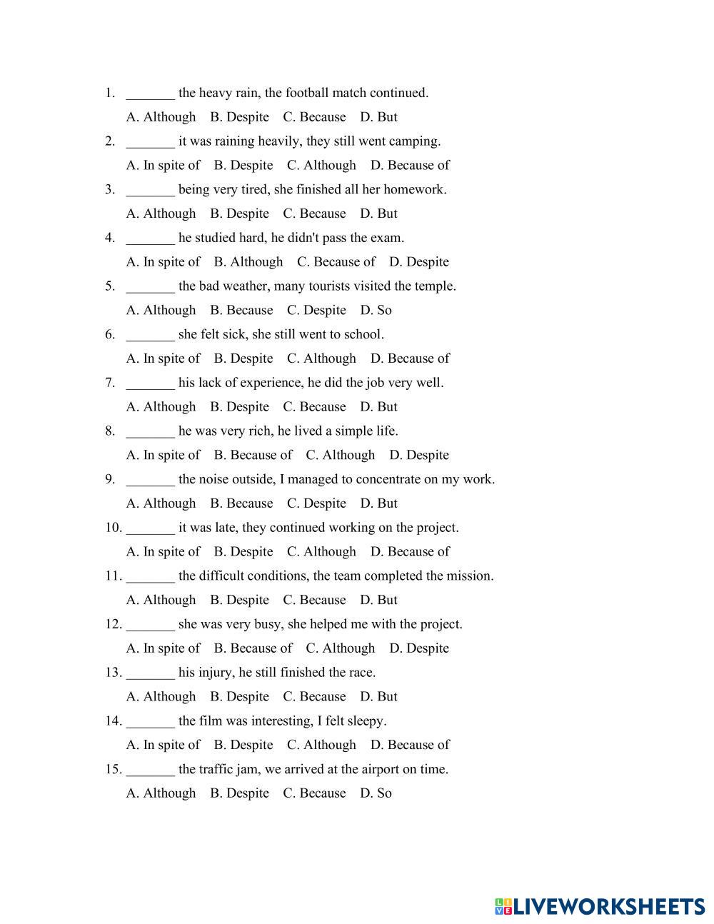 Created byPHAM LINH English Language High School 9th grade Research English Author's Instructions Choose the correct option My Google Classroom Courses × 0 classes selected (0 students total) Quick Access Select all classes (0 classes) All Classes Loading courses... Cancel Share Share to selected Course __COURSE_NAME__ __STUDENT_NAME__ (__STUDENT_EMAIL__) IN SPITE OF / DESPITE / ALTHOUGH Download Worksheet Validation Check my answers Emails my answers to my teacher Full name Group/level School subject Teacher's email or key code Close Submit Validating worksheet... (12) Your answers have been sent to your teacher. Good luck! OK We encountered an error submitting your answers. Please try again. OK Advertisement | Go Ad Free Created byPHAM LINH English Language High School 9th grade Research English Author's Instructions Choose the correct option Explore Worksheets Sintagmas_Ej 1 Señala los núcleos y el tipo de sintagma English Language 9th grade Sintagmas_Ej 1 Señala los núcleos y el tipo de sintagma Research - English Language Localiza el núcleo de cada sintagma. Después, clasifícalo. Assessment 5 English Language 9th grade Assessment 5 Research - English Language Hi Students, Do this assessment and send it on teams Topic 8: Tourism English Language 9th grade Topic 8: Tourism Research - English Language test Round Up 4 Progress check Units 1-4 English Language 9th grade Round Up 4 Progress check Units 1-4 Research - English Language Complete the tasks carefully