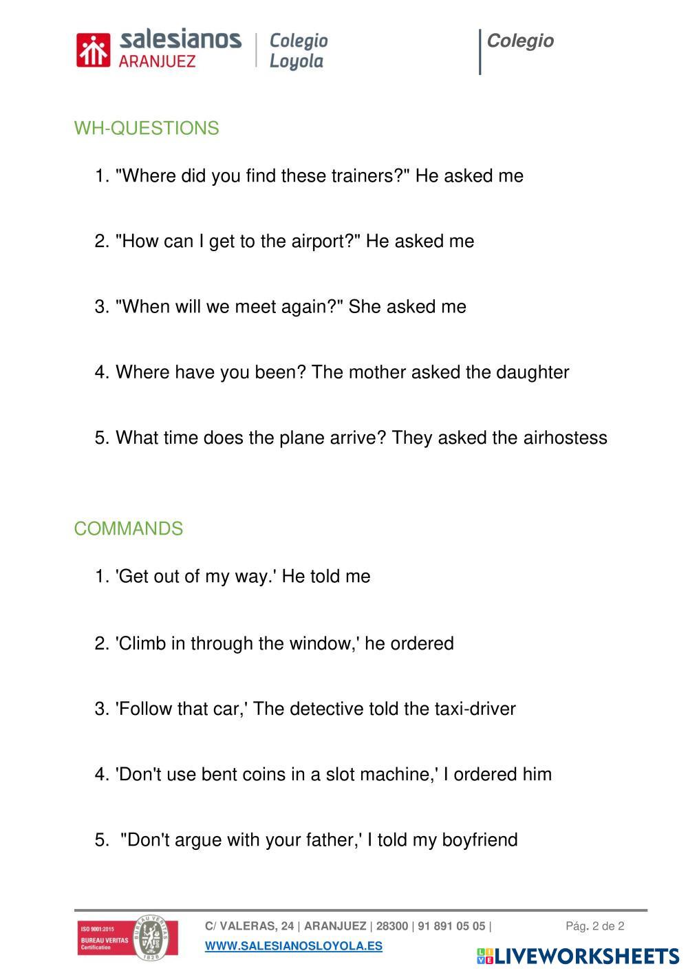 Created by RAQUELHP English Language High School 12th grade Research English Author's Instructions Write the following sentences in Reported Speech. My Google Classroom Courses × 0 classes selected (0 students total) Quick Access Select all classes (0 classes) All Classes Loading courses... Cancel Share Share to selected Course __COURSE_NAME__ __STUDENT_NAME__ (__STUDENT_EMAIL__) REPORTED SPEECH STATEMENTS/QUESTIONS/COMMANDS Download Worksheet Validation Check my answers Emails my answers to my teacher Full name Group/level School subject Teacher's email or key code Close Submit Validating worksheet... (12) Your answers have been sent to your teacher. Good luck! OK We encountered an error submitting your answers. Please try again. OK Advertisement | Go Ad Free Created by RAQUELHP English Language High School 12th grade Research English Author's Instructions Write the following sentences in Reported Speech. Explore Worksheets LISTENING SECTION-Healthy Eating Habits English Language 12th grade LISTENING SECTION-Healthy Eating Habits Research - English Language Students will develop their listening comprehension skills by identifying specific information, main ideas, and opinions about healthy eating. P. 14 English Language 12th grade P. 14 Research - English Language ---- P. 15 English Language 12th grade P. 15 Research - English Language .... Roadmap B1 8C English Language 12th grade Roadmap B1 8C Research - English Language Geographical features