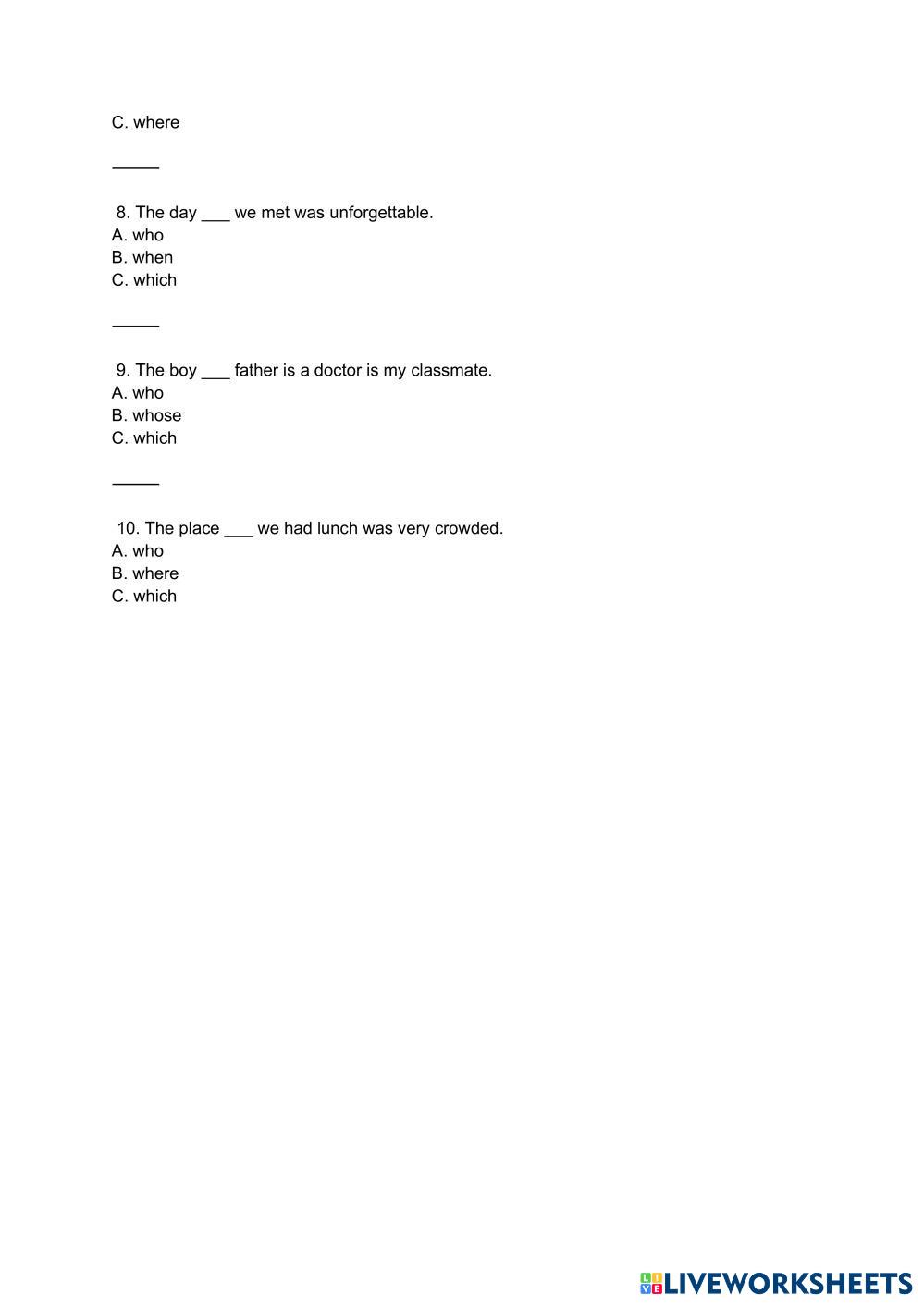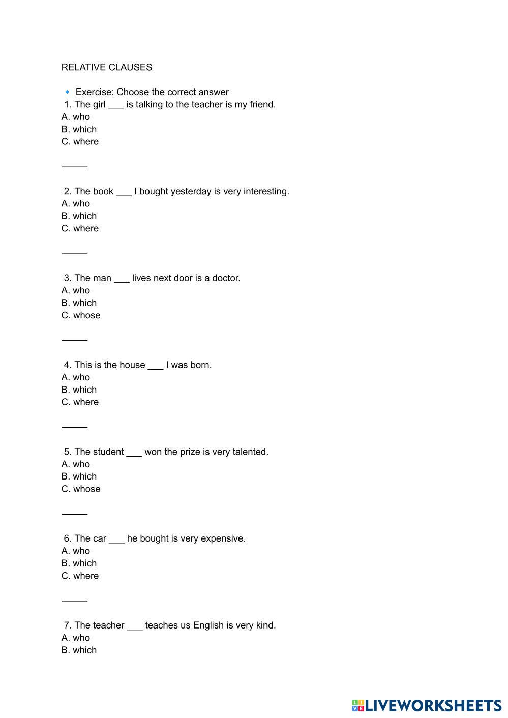 Created by vittrngnguyn English Language High School 12th grade Research English Author's Instructions Relative clause My Google Classroom Courses × 0 classes selected (0 students total) Quick Access Select all classes (0 classes) All Classes Loading courses... Cancel Share Share to selected Course __COURSE_NAME__ __STUDENT_NAME__ (__STUDENT_EMAIL__) Relative clause Download Worksheet Validation Check my answers Emails my answers to my teacher Full name Group/level School subject Teacher's email or key code Close Submit Validating worksheet... (12) Your answers have been sent to your teacher. Good luck! OK We encountered an error submitting your answers. Please try again. OK Advertisement | Go Ad Free Created by vittrngnguyn English Language High School 12th grade Research English Author's Instructions Relative clause Explore Worksheets Exercise English Language 12th grade Exercise Research - English Language abc IELTS 18 GENERAL TEST 2 LISTENING English Language 12th grade IELTS 18 GENERAL TEST 2 LISTENING Research - English Language IELTS EXAM LISTENING tipologías textuales. English Language 12th grade tipologías textuales. Research - English Language tipoloías textuales grammar English Language 12th grade grammar Research - English Language choose the correct answer