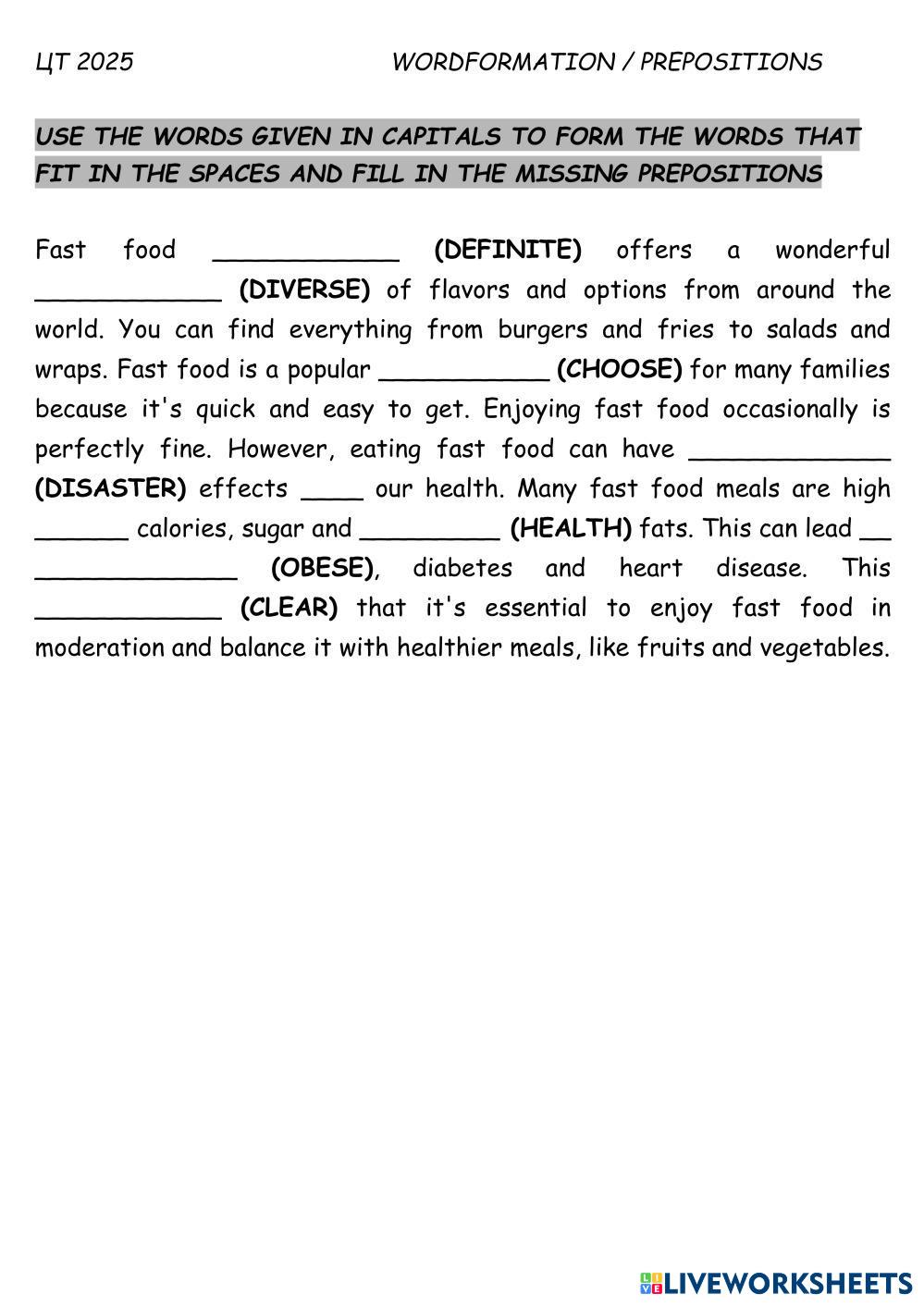 Created by Mika_tima English Language High School 12th grade Vocabulary English Author's Instructions Form the words and fill in the missing prepositions My Google Classroom Courses × 0 classes selected (0 students total) Quick Access Select all classes (0 classes) All Classes Loading courses... Cancel Share Share to selected Course __COURSE_NAME__ __STUDENT_NAME__ (__STUDENT_EMAIL__) ЦТ 2025 Wordformation prepositions Вар 4 Download Worksheet Validation Check my answers Emails my answers to my teacher Full name Group/level School subject Teacher's email or key code Close Submit Validating worksheet... (12) Your answers have been sent to your teacher. Good luck! OK We encountered an error submitting your answers. Please try again. OK Advertisement | Go Ad Free Created by Mika_tima English Language High School 12th grade Vocabulary English Author's Instructions Form the words and fill in the missing prepositions Explore Worksheets Translation Exercise: Vessel Types English Language 12th grade Translation Exercise: Vessel Types Vocabulary - English Language COMPLETE THE FOLLOWING TRANSLATIONS TO CREATE A BILINGUAL TEXT Listening test 1 - Daily routine English Language 12th grade Listening test 1 - Daily routine Vocabulary - English Language Listen and choose the correct answer Test Freddy English Language 12th grade Test Freddy Vocabulary - English Language Listen and choose the answer Compounds English Language 12th grade Compounds Vocabulary - English Language Read