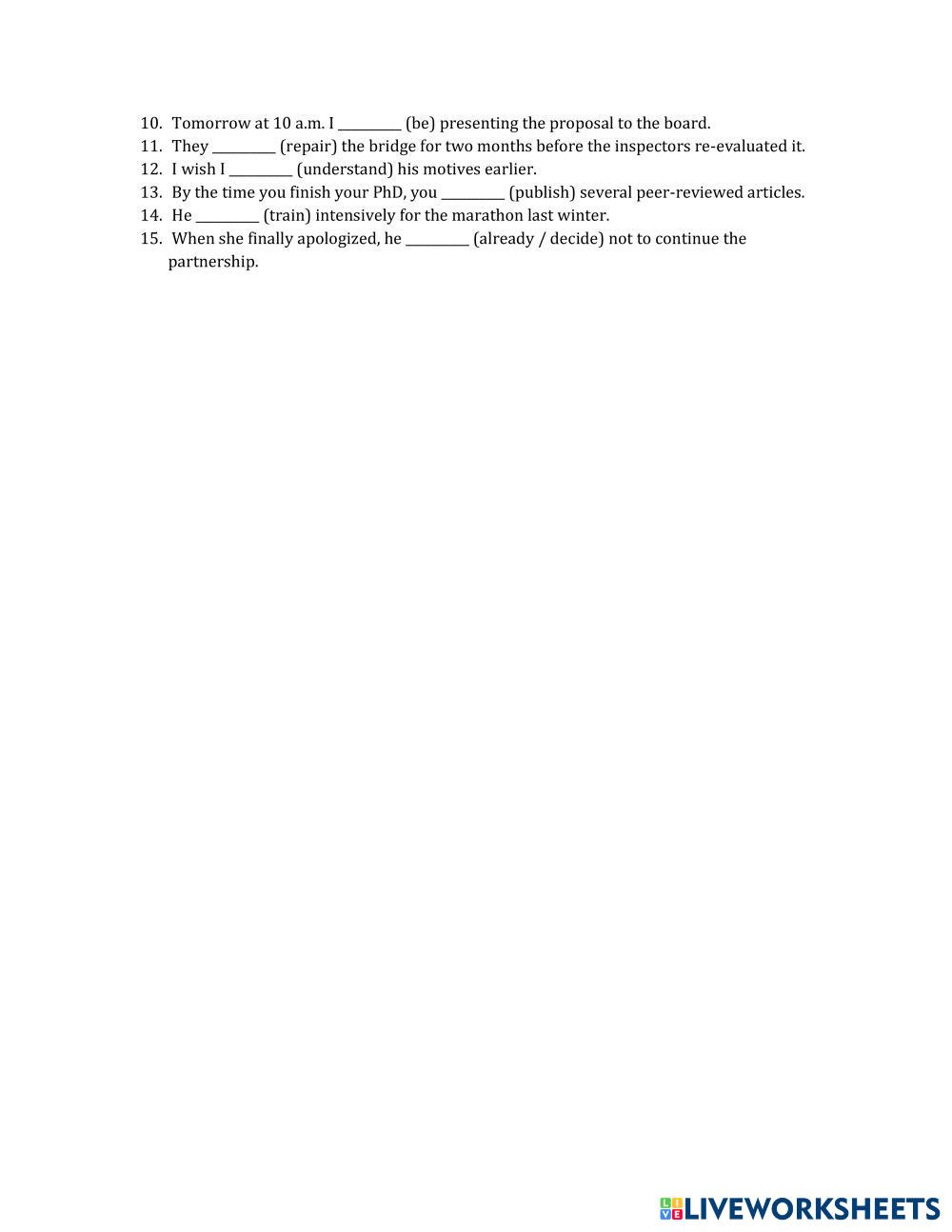 Created by jovitaga English Language High School 11th grade Vocabulary English Author's Instructions Choose the correct option My Google Classroom Courses × 0 classes selected (0 students total) Quick Access Select all classes (0 classes) All Classes Loading courses... Cancel Share Share to selected Course __COURSE_NAME__ __STUDENT_NAME__ (__STUDENT_EMAIL__) C1 test on tenses Download Worksheet Validation Check my answers Emails my answers to my teacher Full name Group/level School subject Teacher's email or key code Close Submit Validating worksheet... (12) Your answers have been sent to your teacher. Good luck! OK We encountered an error submitting your answers. Please try again. OK Advertisement | Go Ad Free Created by jovitaga English Language High School 11th grade Vocabulary English Author's Instructions Choose the correct option Explore Worksheets GRADE 11 MID-TERM 1 English Language 11th grade GRADE 11 MID-TERM 1 Vocabulary - English Language GRAMAR English Vocabularu M.5 Week1 English Language 11th grade English Vocabularu M.5 Week1 Vocabulary - English Language listen and repeat vocabulary English Vocabularu M.5 Week1 English Language 11th grade English Vocabularu M.5 Week1 Vocabulary - English Language listen to the vocabulary GRADE 11, LISTENING TEST UNIT 1,2,3 English Language 11th grade GRADE 11, LISTENING TEST UNIT 1,2,3 Vocabulary - English Language L