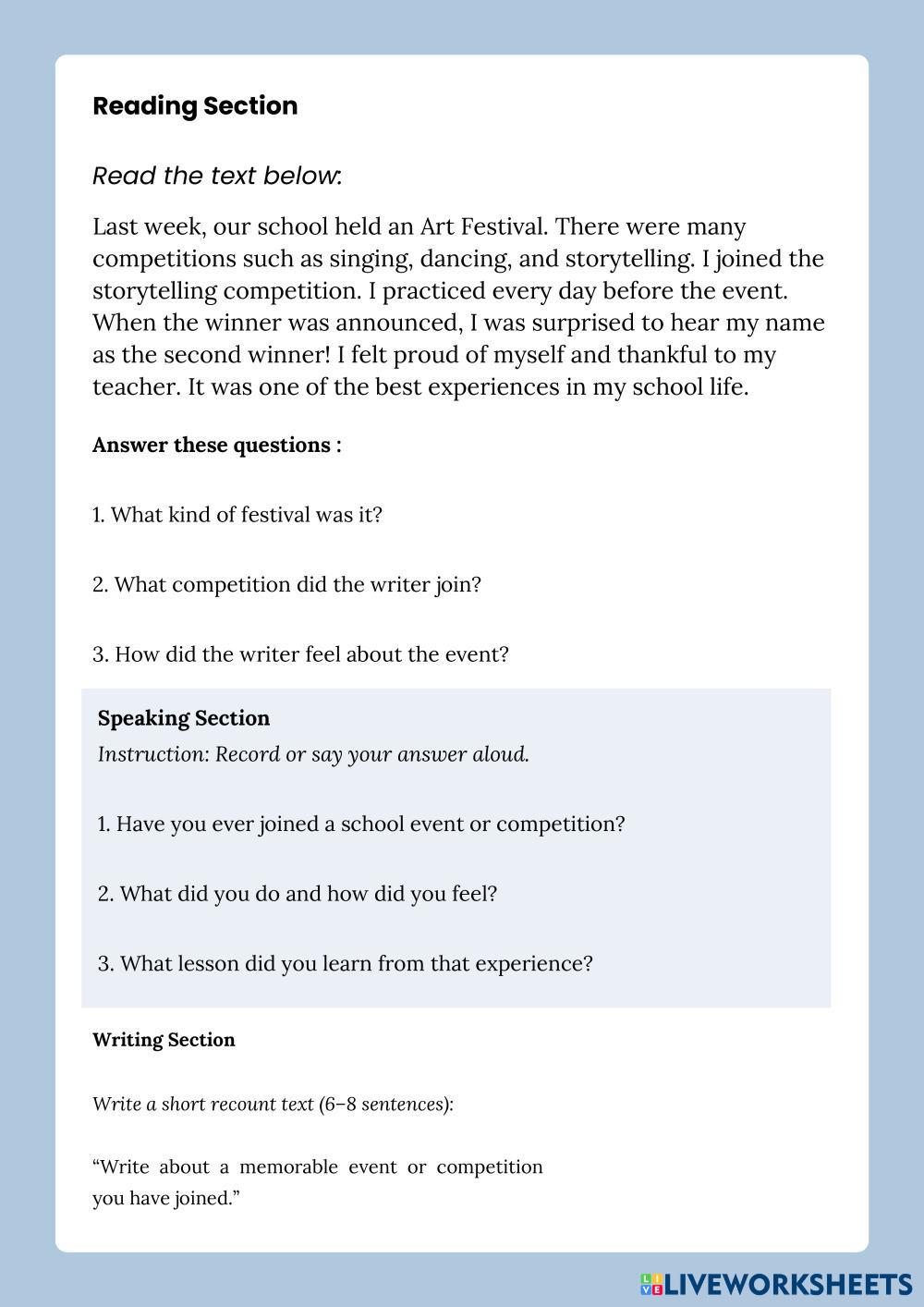 2. Answer the Listening, Reading, Speaking, and Writing tasks.