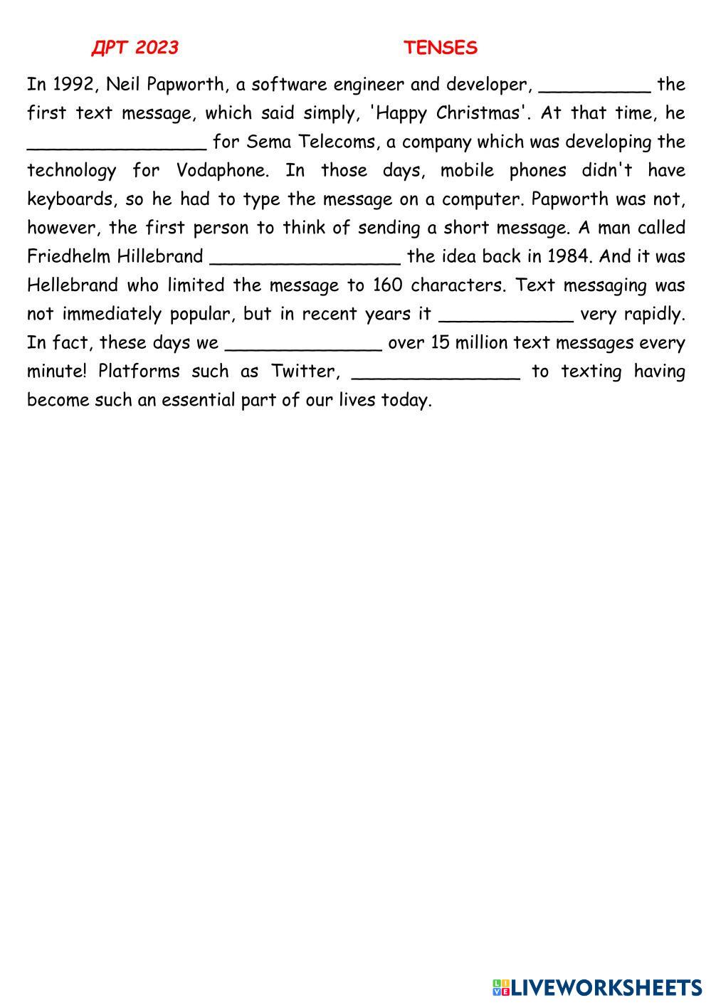 Created by Mika_tima English Language High School 12th grade Vocabulary English Author's Instructions Choose the right variant My Google Classroom Courses × 0 classes selected (0 students total) Quick Access Select all classes (0 classes) All Classes Loading courses... Cancel Share Share to selected Course __COURSE_NAME__ __STUDENT_NAME__ (__STUDENT_EMAIL__) ДРТ 2023 TENSES Download Worksheet Validation Check my answers Emails my answers to my teacher Full name Group/level School subject Teacher's email or key code Close Submit Validating worksheet... (12) Your answers have been sent to your teacher. Good luck! OK We encountered an error submitting your answers. Please try again. OK Advertisement | Go Ad Free Created by Mika_tima English Language High School 12th grade Vocabulary English Author's Instructions Choose the right variant Explore Worksheets Listening test 1 - Daily routine English Language 12th grade Listening test 1 - Daily routine Vocabulary - English Language Listen and choose the correct answer Translation Exercise: Vessel Types English Language 12th grade Translation Exercise: Vessel Types Vocabulary - English Language COMPLETE THE FOLLOWING TRANSLATIONS TO CREATE A BILINGUAL TEXT Test Freddy English Language 12th grade Test Freddy Vocabulary - English Language Listen and choose the answer Compounds English Language 12th grade Compounds Vocabulary - English Language Read