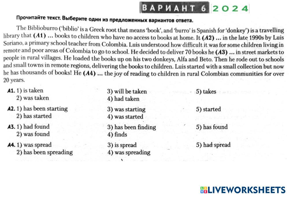 Created by Mika_tima English Language High School 12th grade Vocabulary English Author's Instructions Choose the right variant My Google Classroom Courses × 0 classes selected (0 students total) Quick Access Select all classes (0 classes) All Classes Loading courses... Cancel Share Share to selected Course __COURSE_NAME__ __STUDENT_NAME__ (__STUDENT_EMAIL__) ЦТ 2024 TENSES B 6 Download Worksheet Validation Check my answers Emails my answers to my teacher Full name Group/level School subject Teacher's email or key code Close Submit Validating worksheet... (12) Your answers have been sent to your teacher. Good luck! OK We encountered an error submitting your answers. Please try again. OK Advertisement | Go Ad Free Created by Mika_tima English Language High School 12th grade Vocabulary English Author's Instructions Choose the right variant Explore Worksheets Translation Exercise: Vessel Types English Language 12th grade Translation Exercise: Vessel Types Vocabulary - English Language COMPLETE THE FOLLOWING TRANSLATIONS TO CREATE A BILINGUAL TEXT Listening test 1 - Daily routine English Language 12th grade Listening test 1 - Daily routine Vocabulary - English Language Listen and choose the correct answer Test Freddy English Language 12th grade Test Freddy Vocabulary - English Language Listen and choose the answer Compounds English Language 12th grade Compounds Vocabulary - English Language Read