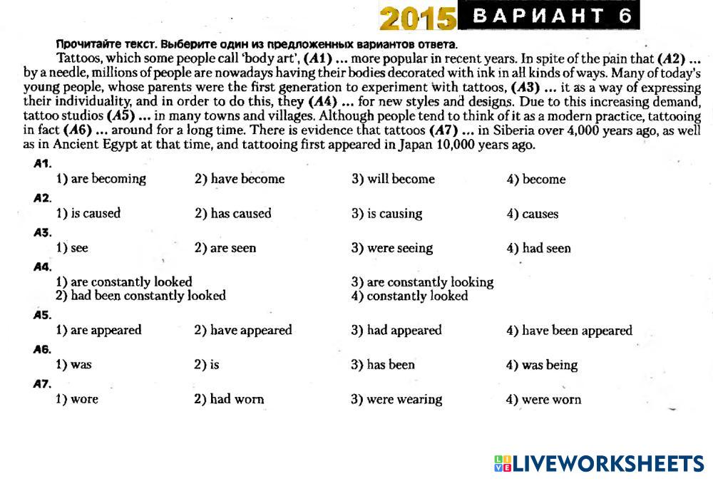 Created by Mika_tima English Language High School 12th grade Vocabulary English Author's Instructions Choose the right variant My Google Classroom Courses × 0 classes selected (0 students total) Quick Access Select all classes (0 classes) All Classes Loading courses... Cancel Share Share to selected Course __COURSE_NAME__ __STUDENT_NAME__ (__STUDENT_EMAIL__) ЦТ 2015 Вариант 6 Tenses Download Worksheet Validation Check my answers Emails my answers to my teacher Full name Group/level School subject Teacher's email or key code Close Submit Validating worksheet... (12) Your answers have been sent to your teacher. Good luck! OK We encountered an error submitting your answers. Please try again. OK Advertisement | Go Ad Free Created by Mika_tima English Language High School 12th grade Vocabulary English Author's Instructions Choose the right variant Explore Worksheets Translation Exercise: Vessel Types English Language 12th grade Translation Exercise: Vessel Types Vocabulary - English Language COMPLETE THE FOLLOWING TRANSLATIONS TO CREATE A BILINGUAL TEXT Listening test 1 - Daily routine English Language 12th grade Listening test 1 - Daily routine Vocabulary - English Language Listen and choose the correct answer Test Freddy English Language 12th grade Test Freddy Vocabulary - English Language Listen and choose the answer Compounds English Language 12th grade Compounds Vocabulary - English Language Read