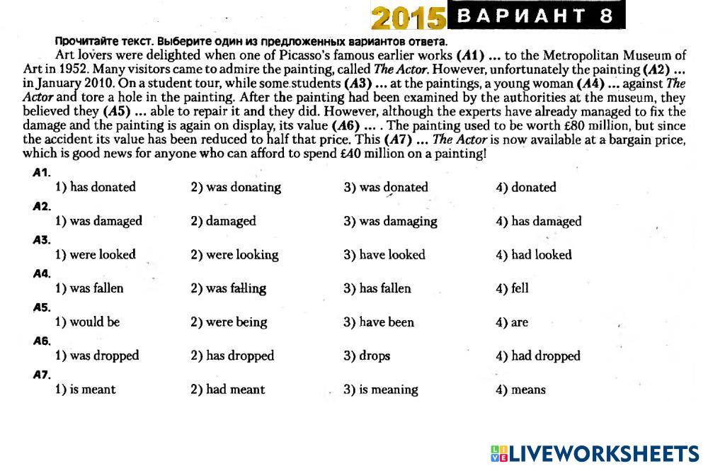 Created by Mika_tima English Language High School 12th grade Vocabulary English Author's Instructions Choose the right variant My Google Classroom Courses × 0 classes selected (0 students total) Quick Access Select all classes (0 classes) All Classes Loading courses... Cancel Share Share to selected Course __COURSE_NAME__ __STUDENT_NAME__ (__STUDENT_EMAIL__) ЦТ 2015 Вариант 8 Tenses Download Worksheet Validation Check my answers Emails my answers to my teacher Full name Group/level School subject Teacher's email or key code Close Submit Validating worksheet... (12) Your answers have been sent to your teacher. Good luck! OK We encountered an error submitting your answers. Please try again. OK Advertisement | Go Ad Free Created by Mika_tima English Language High School 12th grade Vocabulary English Author's Instructions Choose the right variant Explore Worksheets Translation Exercise: Vessel Types English Language 12th grade Translation Exercise: Vessel Types Vocabulary - English Language COMPLETE THE FOLLOWING TRANSLATIONS TO CREATE A BILINGUAL TEXT Listening test 1 - Daily routine English Language 12th grade Listening test 1 - Daily routine Vocabulary - English Language Listen and choose the correct answer Test Freddy English Language 12th grade Test Freddy Vocabulary - English Language Listen and choose the answer Compounds English Language 12th grade Compounds Vocabulary - English Language Read