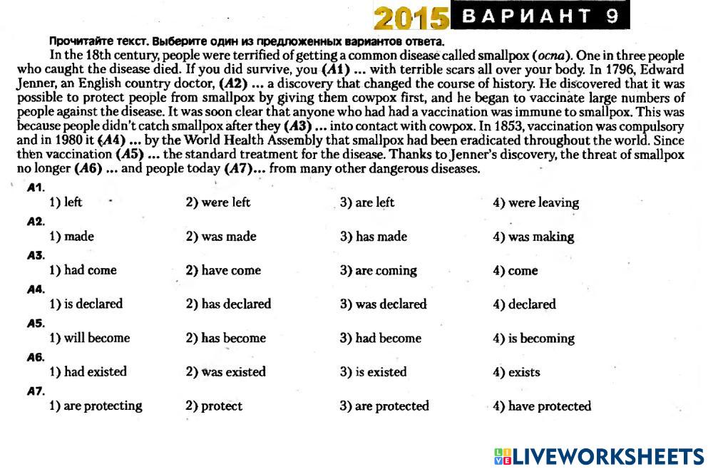 Created by Mika_tima English Language High School 12th grade Vocabulary English Author's Instructions Choose the right variant My Google Classroom Courses × 0 classes selected (0 students total) Quick Access Select all classes (0 classes) All Classes Loading courses... Cancel Share Share to selected Course __COURSE_NAME__ __STUDENT_NAME__ (__STUDENT_EMAIL__) ЦТ 2015 Вариант 9 Tenses Download Worksheet Validation Check my answers Emails my answers to my teacher Full name Group/level School subject Teacher's email or key code Close Submit Validating worksheet... (12) Your answers have been sent to your teacher. Good luck! OK We encountered an error submitting your answers. Please try again. OK Advertisement | Go Ad Free Created by Mika_tima English Language High School 12th grade Vocabulary English Author's Instructions Choose the right variant Explore Worksheets Translation Exercise: Vessel Types English Language 12th grade Translation Exercise: Vessel Types Vocabulary - English Language COMPLETE THE FOLLOWING TRANSLATIONS TO CREATE A BILINGUAL TEXT Listening test 1 - Daily routine English Language 12th grade Listening test 1 - Daily routine Vocabulary - English Language Listen and choose the correct answer Test Freddy English Language 12th grade Test Freddy Vocabulary - English Language Listen and choose the answer Compounds English Language 12th grade Compounds Vocabulary - English Language Read