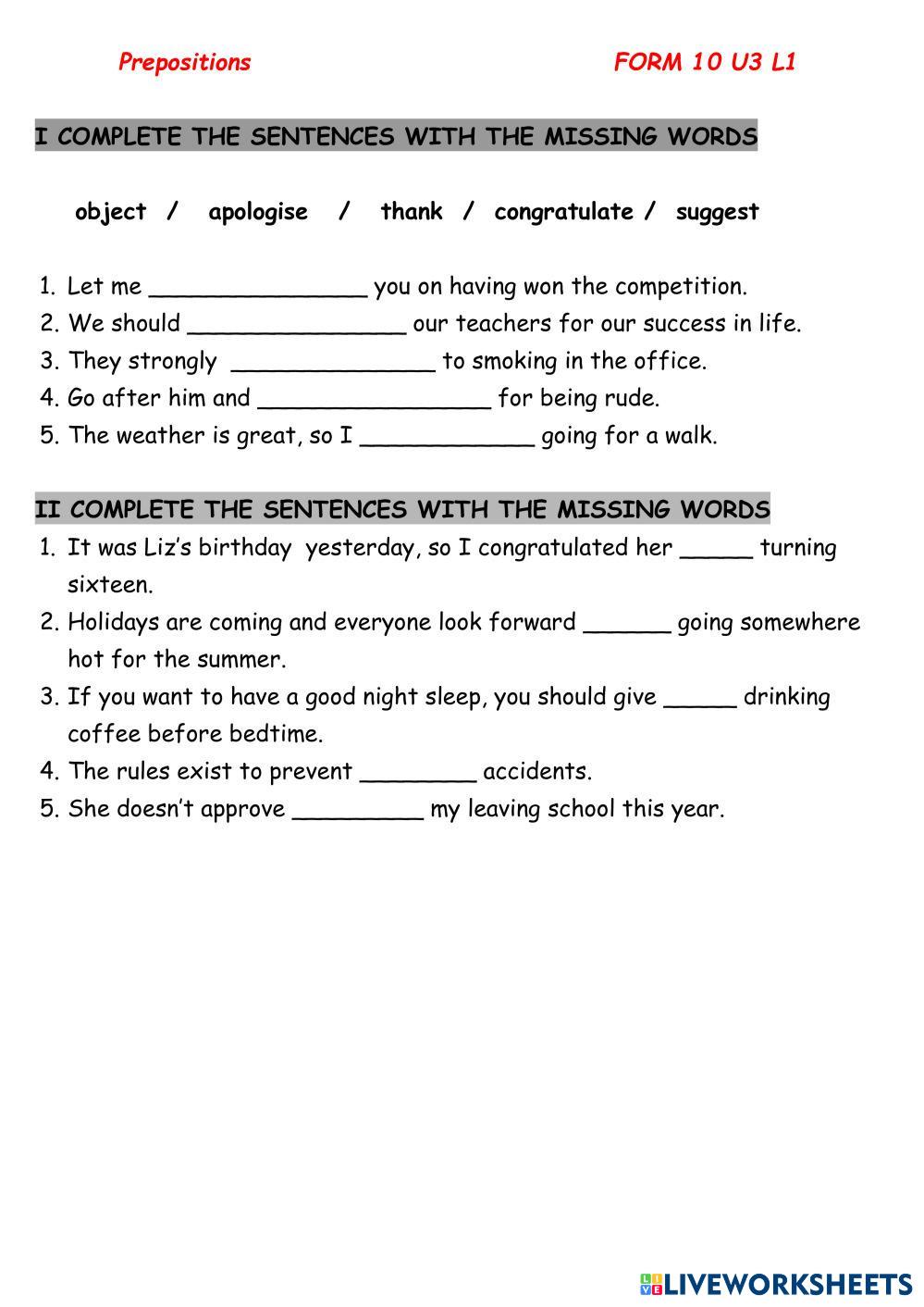 Created by Mika_tima English Language High School 12th grade Vocabulary English Author's Instructions Fill in the missing information My Google Classroom Courses × 0 classes selected (0 students total) Quick Access Select all classes (0 classes) All Classes Loading courses... Cancel Share Share to selected Course __COURSE_NAME__ __STUDENT_NAME__ (__STUDENT_EMAIL__) Prepositions F10 U3 L1 Download Worksheet Validation Check my answers Emails my answers to my teacher Full name Group/level School subject Teacher's email or key code Close Submit Validating worksheet... (12) Your answers have been sent to your teacher. Good luck! OK We encountered an error submitting your answers. Please try again. OK Advertisement | Go Ad Free Created by Mika_tima English Language High School 12th grade Vocabulary English Author's Instructions Fill in the missing information Explore Worksheets Translation Exercise: Vessel Types English Language 12th grade Translation Exercise: Vessel Types Vocabulary - English Language COMPLETE THE FOLLOWING TRANSLATIONS TO CREATE A BILINGUAL TEXT Listening test 1 - Daily routine English Language 12th grade Listening test 1 - Daily routine Vocabulary - English Language Listen and choose the correct answer Test Freddy English Language 12th grade Test Freddy Vocabulary - English Language Listen and choose the answer Compounds English Language 12th grade Compounds Vocabulary - English Language Read