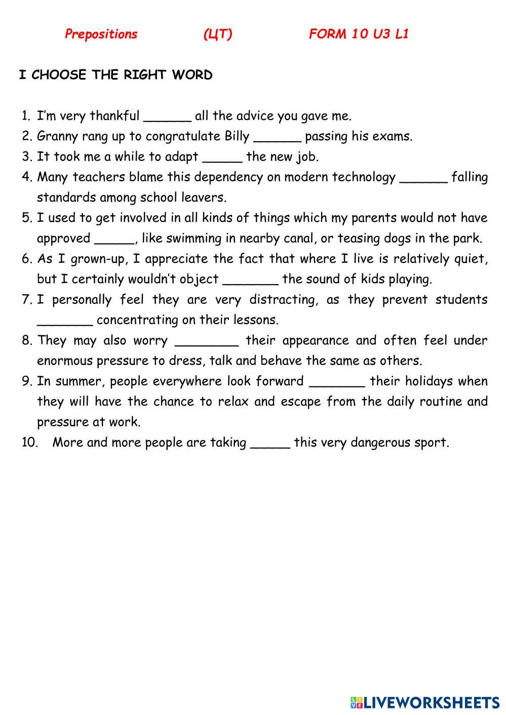 Created by Mika_tima English Language High School 12th grade Vocabulary English Author's Instructions Fill in the missing prepositions My Google Classroom Courses × 0 classes selected (0 students total) Quick Access Select all classes (0 classes) All Classes Loading courses... Cancel Share Share to selected Course __COURSE_NAME__ __STUDENT_NAME__ (__STUDENT_EMAIL__) Prepositions 1 F10 U3 L1 Download Worksheet Validation Check my answers Emails my answers to my teacher Full name Group/level School subject Teacher's email or key code Close Submit Validating worksheet... (12) Your answers have been sent to your teacher. Good luck! OK We encountered an error submitting your answers. Please try again. OK Advertisement | Go Ad Free Created by Mika_tima English Language High School 12th grade Vocabulary English Author's Instructions Fill in the missing prepositions Explore Worksheets Translation Exercise: Vessel Types English Language 12th grade Translation Exercise: Vessel Types Vocabulary - English Language COMPLETE THE FOLLOWING TRANSLATIONS TO CREATE A BILINGUAL TEXT Listening test 1 - Daily routine English Language 12th grade Listening test 1 - Daily routine Vocabulary - English Language Listen and choose the correct answer Test Freddy English Language 12th grade Test Freddy Vocabulary - English Language Listen and choose the answer Compounds English Language 12th grade Compounds Vocabulary - English Language Read