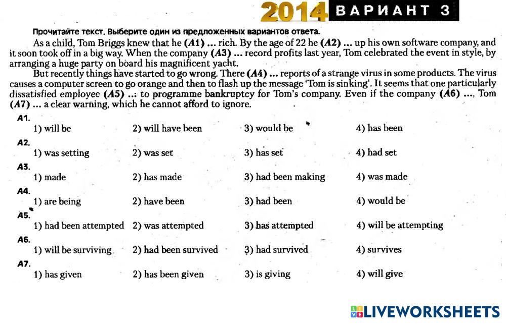 Created by Mika_tima English Language High School 12th grade Vocabulary English Author's Instructions Choose the right variant My Google Classroom Courses × 0 classes selected (0 students total) Quick Access Select all classes (0 classes) All Classes Loading courses... Cancel Share Share to selected Course __COURSE_NAME__ __STUDENT_NAME__ (__STUDENT_EMAIL__) ЦТ 2014 ВРЕМЕНА В3 Download Worksheet Validation Check my answers Emails my answers to my teacher Full name Group/level School subject Teacher's email or key code Close Submit Validating worksheet... (12) Your answers have been sent to your teacher. Good luck! OK We encountered an error submitting your answers. Please try again. OK Advertisement | Go Ad Free Created by Mika_tima English Language High School 12th grade Vocabulary English Author's Instructions Choose the right variant Explore Worksheets Translation Exercise: Vessel Types English Language 12th grade Translation Exercise: Vessel Types Vocabulary - English Language COMPLETE THE FOLLOWING TRANSLATIONS TO CREATE A BILINGUAL TEXT Listening test 1 - Daily routine English Language 12th grade Listening test 1 - Daily routine Vocabulary - English Language Listen and choose the correct answer Test Freddy English Language 12th grade Test Freddy Vocabulary - English Language Listen and choose the answer Compounds English Language 12th grade Compounds Vocabulary - English Language Read