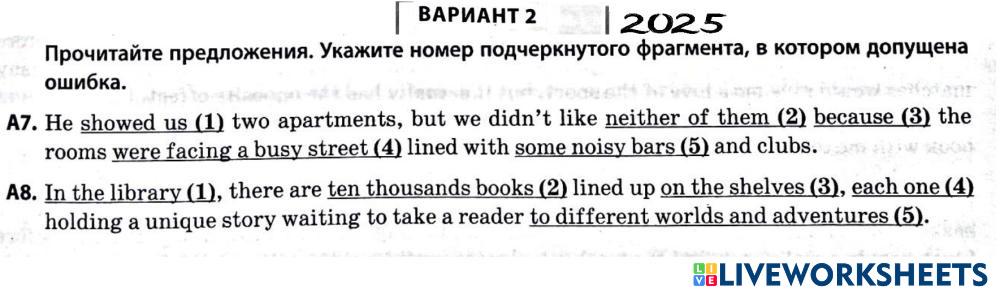 Created by Mika_tima English Language High School 12th grade Vocabulary English Author's Instructions Выберите фрагмент, в котором допущена ошибка My Google Classroom Courses × 0 classes selected (0 students total) Quick Access Select all classes (0 classes) All Classes Loading courses... Cancel Share Share to selected Course __COURSE_NAME__ __STUDENT_NAME__ (__STUDENT_EMAIL__) ОШИБКИ ЦТ 2025 ВАРИАНТ 2 Download Worksheet Validation Check my answers Emails my answers to my teacher Full name Group/level School subject Teacher's email or key code Close Submit Validating worksheet... (12) Your answers have been sent to your teacher. Good luck! OK We encountered an error submitting your answers. Please try again. OK Advertisement | Go Ad Free Created by Mika_tima English Language High School 12th grade Vocabulary English Author's Instructions Выберите фрагмент, в котором допущена ошибка Explore Worksheets Translation Exercise: Vessel Types English Language 12th grade Translation Exercise: Vessel Types Vocabulary - English Language COMPLETE THE FOLLOWING TRANSLATIONS TO CREATE A BILINGUAL TEXT Listening test 1 - Daily routine English Language 12th grade Listening test 1 - Daily routine Vocabulary - English Language Listen and choose the correct answer Test Freddy English Language 12th grade Test Freddy Vocabulary - English Language Listen and choose the answer Compounds English Language 12th grade Compounds Vocabulary - English Language Read