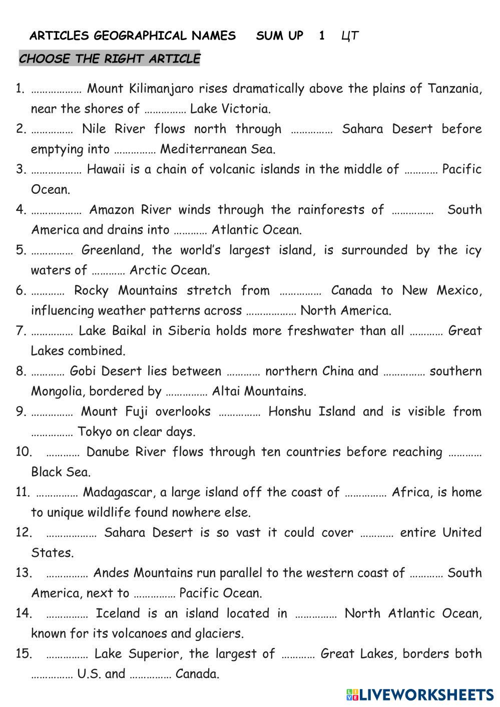 Created by Mika_tima English Language High School 12th grade Vocabulary English Author's Instructions Choose the right article My Google Classroom Courses × 0 classes selected (0 students total) Quick Access Select all classes (0 classes) All Classes Loading courses... Cancel Share Share to selected Course __COURSE_NAME__ __STUDENT_NAME__ (__STUDENT_EMAIL__) Geographical Names 1 Download Worksheet Validation Check my answers Emails my answers to my teacher Full name Group/level School subject Teacher's email or key code Close Submit Validating worksheet... (12) Your answers have been sent to your teacher. Good luck! OK We encountered an error submitting your answers. Please try again. OK Advertisement | Go Ad Free Created by Mika_tima English Language High School 12th grade Vocabulary English Author's Instructions Choose the right article Explore Worksheets Translation Exercise: Vessel Types English Language 12th grade Translation Exercise: Vessel Types Vocabulary - English Language COMPLETE THE FOLLOWING TRANSLATIONS TO CREATE A BILINGUAL TEXT Listening test 1 - Daily routine English Language 12th grade Listening test 1 - Daily routine Vocabulary - English Language Listen and choose the correct answer Test Freddy English Language 12th grade Test Freddy Vocabulary - English Language Listen and choose the answer Compounds English Language 12th grade Compounds Vocabulary - English Language Read