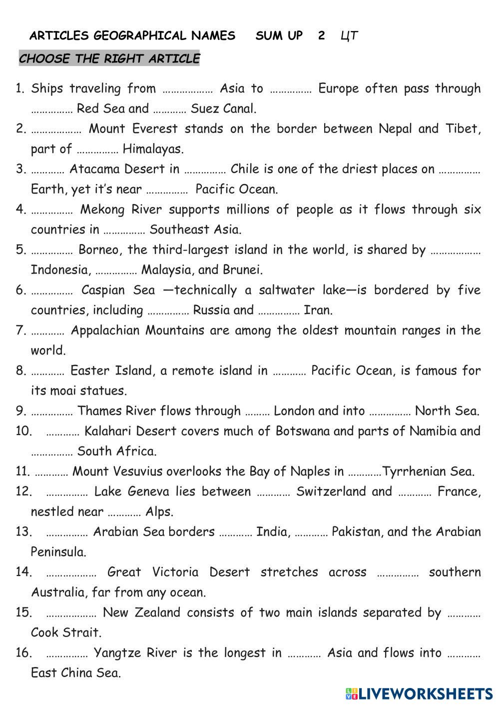 Created by Mika_tima English Language High School 12th grade Vocabulary English Author's Instructions Choose the right article My Google Classroom Courses × 0 classes selected (0 students total) Quick Access Select all classes (0 classes) All Classes Loading courses... Cancel Share Share to selected Course __COURSE_NAME__ __STUDENT_NAME__ (__STUDENT_EMAIL__) Geographical Names 2 Download Worksheet Validation Check my answers Emails my answers to my teacher Full name Group/level School subject Teacher's email or key code Close Submit Validating worksheet... (12) Your answers have been sent to your teacher. Good luck! OK We encountered an error submitting your answers. Please try again. OK Advertisement | Go Ad Free Created by Mika_tima English Language High School 12th grade Vocabulary English Author's Instructions Choose the right article Explore Worksheets Translation Exercise: Vessel Types English Language 12th grade Translation Exercise: Vessel Types Vocabulary - English Language COMPLETE THE FOLLOWING TRANSLATIONS TO CREATE A BILINGUAL TEXT Listening test 1 - Daily routine English Language 12th grade Listening test 1 - Daily routine Vocabulary - English Language Listen and choose the correct answer Test Freddy English Language 12th grade Test Freddy Vocabulary - English Language Listen and choose the answer Compounds English Language 12th grade Compounds Vocabulary - English Language Read