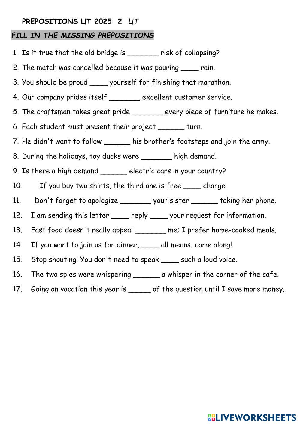 Created by Mika_tima English Language High School 12th grade Vocabulary English Author's Instructions FILL IN THE MISSING PREPOSITIONS My Google Classroom Courses × 0 classes selected (0 students total) Quick Access Select all classes (0 classes) All Classes Loading courses... Cancel Share Share to selected Course __COURSE_NAME__ __STUDENT_NAME__ (__STUDENT_EMAIL__) Prepositions ЦТ 2025 Download Worksheet Validation Check my answers Emails my answers to my teacher Full name Group/level School subject Teacher's email or key code Close Submit Validating worksheet... (12) Your answers have been sent to your teacher. Good luck! OK We encountered an error submitting your answers. Please try again. OK Advertisement | Go Ad Free Created by Mika_tima English Language High School 12th grade Vocabulary English Author's Instructions FILL IN THE MISSING PREPOSITIONS Explore Worksheets Translation Exercise: Vessel Types English Language 12th grade Translation Exercise: Vessel Types Vocabulary - English Language COMPLETE THE FOLLOWING TRANSLATIONS TO CREATE A BILINGUAL TEXT Listening test 1 - Daily routine English Language 12th grade Listening test 1 - Daily routine Vocabulary - English Language Listen and choose the correct answer Test Freddy English Language 12th grade Test Freddy Vocabulary - English Language Listen and choose the answer Compounds English Language 12th grade Compounds Vocabulary - English Language Read