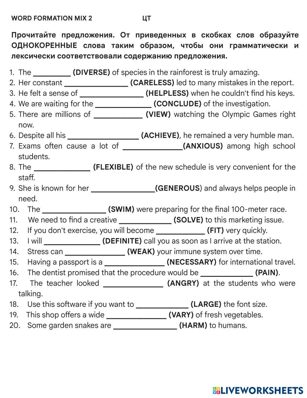 Created by Mika_tima English Language High School 12th grade Vocabulary English Author's Instructions Form the words My Google Classroom Courses × 0 classes selected (0 students total) Quick Access Select all classes (0 classes) All Classes Loading courses... Cancel Share Share to selected Course __COURSE_NAME__ __STUDENT_NAME__ (__STUDENT_EMAIL__) Wordwormation MIX 2 ЦТ Download Worksheet Validation Check my answers Emails my answers to my teacher Full name Group/level School subject Teacher's email or key code Close Submit Validating worksheet... (12) Your answers have been sent to your teacher. Good luck! OK We encountered an error submitting your answers. Please try again. OK Advertisement | Go Ad Free Created by Mika_tima English Language High School 12th grade Vocabulary English Author's Instructions Form the words Explore Worksheets Translation Exercise: Vessel Types English Language 12th grade Translation Exercise: Vessel Types Vocabulary - English Language COMPLETE THE FOLLOWING TRANSLATIONS TO CREATE A BILINGUAL TEXT Listening test 1 - Daily routine English Language 12th grade Listening test 1 - Daily routine Vocabulary - English Language Listen and choose the correct answer Test Freddy English Language 12th grade Test Freddy Vocabulary - English Language Listen and choose the answer Compounds English Language 12th grade Compounds Vocabulary - English Language Read