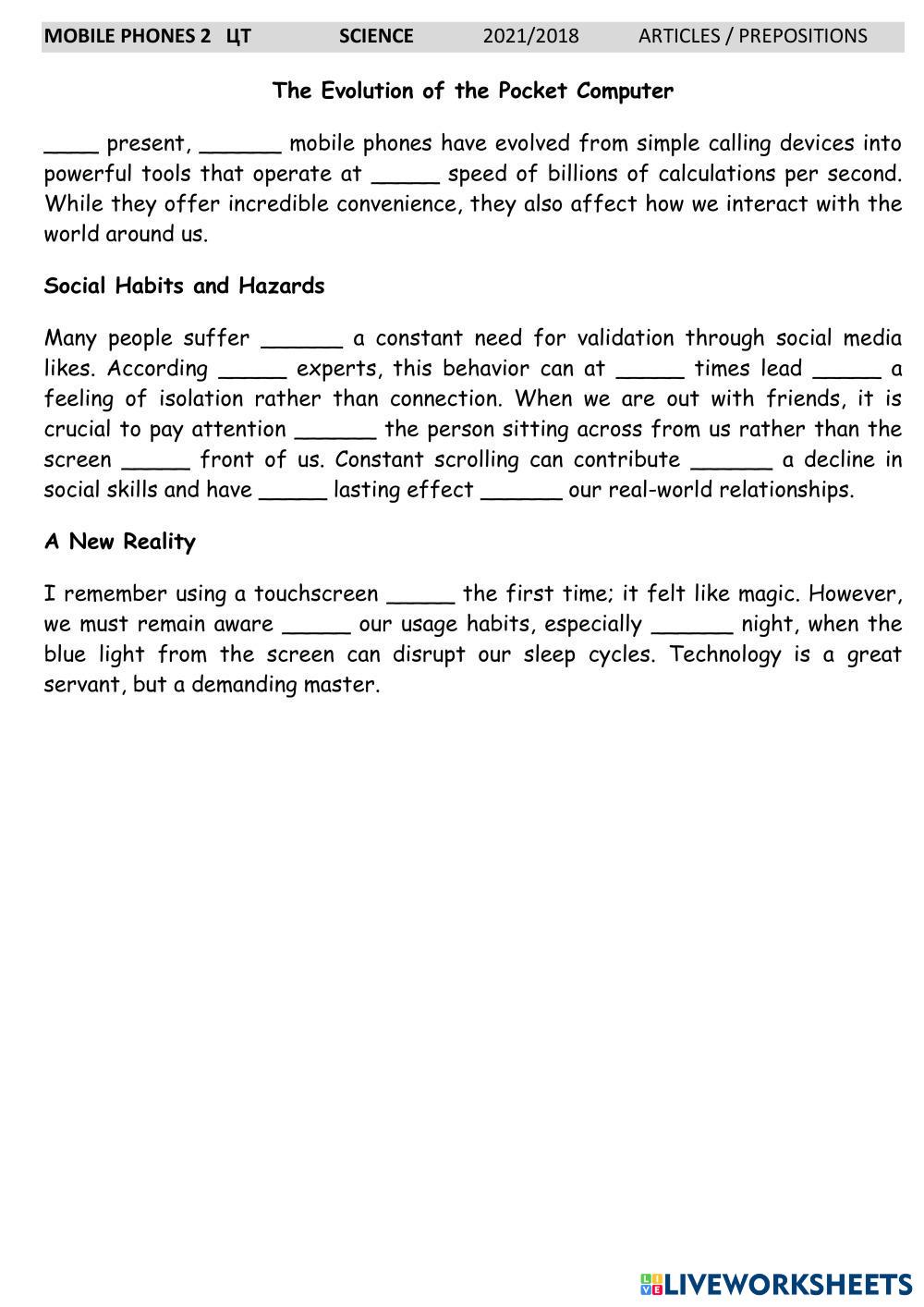 Created by Mika_tima English Language High School 12th grade Vocabulary English Author's Instructions Fill in the missing prepositions and articles My Google Classroom Courses × 0 classes selected (0 students total) Quick Access Select all classes (0 classes) All Classes Loading courses... Cancel Share Share to selected Course __COURSE_NAME__ __STUDENT_NAME__ (__STUDENT_EMAIL__) Mobile phones 2 ЦТ prepositions / articles Download Worksheet Validation Check my answers Emails my answers to my teacher Full name Group/level School subject Teacher's email or key code Close Submit Validating worksheet... (12) Your answers have been sent to your teacher. Good luck! OK We encountered an error submitting your answers. Please try again. OK Advertisement | Go Ad Free Created by Mika_tima English Language High School 12th grade Vocabulary English Author's Instructions Fill in the missing prepositions and articles Explore Worksheets Translation Exercise: Vessel Types English Language 12th grade Translation Exercise: Vessel Types Vocabulary - English Language COMPLETE THE FOLLOWING TRANSLATIONS TO CREATE A BILINGUAL TEXT Listening test 1 - Daily routine English Language 12th grade Listening test 1 - Daily routine Vocabulary - English Language Listen and choose the correct answer Test Freddy English Language 12th grade Test Freddy Vocabulary - English Language Listen and choose the answer Compounds English Language 12th grade Compounds Vocabulary - English Language Read