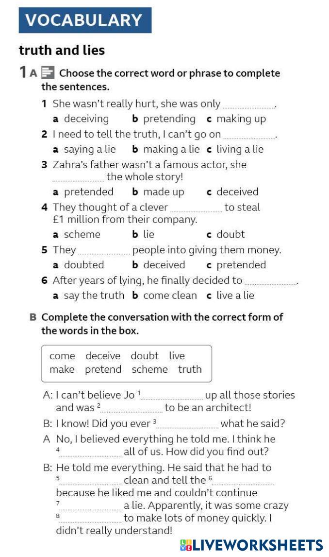Created byMary English Language High School 12th grade Vocabulary English Author's Instructions true and lie My Google Classroom Courses × 0 classes selected (0 students total) Quick Access Select all classes (0 classes) All Classes Loading courses... Cancel Share Share to selected Course __COURSE_NAME__ __STUDENT_NAME__ (__STUDENT_EMAIL__) 4A ex 1 (a) (b) Download Worksheet Validation Check my answers Emails my answers to my teacher Full name Group/level School subject Teacher's email or key code Close Submit Validating worksheet... (12) Your answers have been sent to your teacher. Good luck! OK We encountered an error submitting your answers. Please try again. OK Advertisement | Go Ad Free Created byMary English Language High School 12th grade Vocabulary English Author's Instructions true and lie Explore Worksheets Road Map Unit test 9 B1 English Language 12th grade Road Map Unit test 9 B1 Vocabulary - English Language Unit test NAVIGATE B1 WB UNIT 1 English Language 12th grade NAVIGATE B1 WB UNIT 1 Vocabulary - English Language COMPLETE EXTRA ACTIVITIES FROM UNIT 1 đề 15vip English Language 12th grade đề 15vip Vocabulary - English Language ưewf THE SECOND CONDITIONAL English Language 12th grade THE SECOND CONDITIONAL Vocabulary - English Language In this worksheet, you will practice the second conditional to talk about unreal or imaginary situations in the present or future. Use the structure: If + past simple, would + base verb Pay attention to verb forms and sentence meaning Write full sentences where required