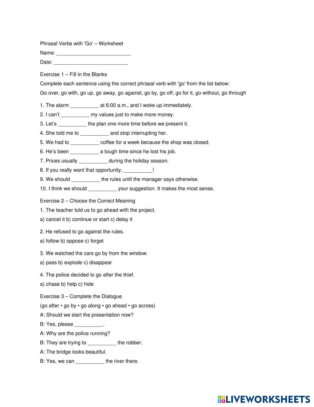 Created by 13555 English Language High School 10th grade Vocabulary English Author's Instructions Follow the instructions to complete the exercises My Google Classroom Courses × 0 classes selected (0 students total) Quick Access Select all classes (0 classes) All Classes Loading courses... Cancel Share Share to selected Course __COURSE_NAME__ __STUDENT_NAME__ (__STUDENT_EMAIL__) Phrasel verbs with GO Download Worksheet Validation Check my answers Emails my answers to my teacher Full name Group/level School subject Teacher's email or key code Close Submit Validating worksheet... (12) Your answers have been sent to your teacher. Good luck! OK We encountered an error submitting your answers. Please try again. OK Advertisement | Go Ad Free Created by 13555 English Language High School 10th grade Vocabulary English Author's Instructions Follow the instructions to complete the exercises Explore Worksheets VOCABULARY UNIT 4 - NEWS TRAVELS FAST English Language 10th grade VOCABULARY UNIT 4 - NEWS TRAVELS FAST Vocabulary - English Language TRADUCE AL IINGLÉS FOCUS 1 Unit 1.3 Listening English Language 10th grade FOCUS 1 Unit 1.3 Listening Vocabulary - English Language Complete the exercises. New High Five p.62-63 English Language 10th grade New High Five p.62-63 Vocabulary - English Language Complete the following exercises. A phone call from a customer English Language 10th grade A phone call from a customer Vocabulary - English Language A phone call from a customer Listen to the phone call from a customer to practise and improve your listening skills. Do the preparation task first. Then listen to the audio and do the exercises.