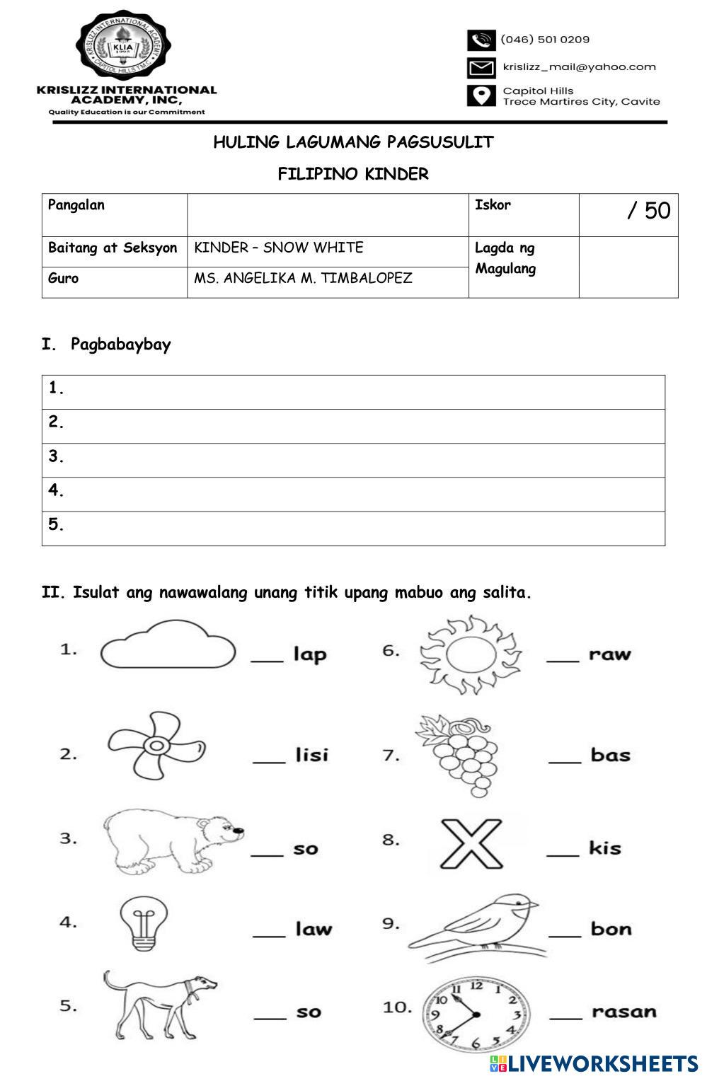 Created by rachellemarilag English Language Early Learning Kindergarten Vocabulary English Author's Instructions FILIPINO My Google Classroom Courses × 0 classes selected (0 students total) Quick Access Select all classes (0 classes) All Classes Loading courses... Cancel Share Share to selected Course __COURSE_NAME__ __STUDENT_NAME__ (__STUDENT_EMAIL__) FILIPINO - A Download Worksheet Validation Check my answers Emails my answers to my teacher Full name Group/level School subject Teacher's email or key code Close Submit Validating worksheet... (12) Your answers have been sent to your teacher. Good luck! OK We encountered an error submitting your answers. Please try again. OK Advertisement | Go Ad Free Created by rachellemarilag English Language Early Learning Kindergarten Vocabulary English Author's Instructions FILIPINO Explore Worksheets ¿Dónde dormimos por la noche? English Language Kindergarten ¿Dónde dormimos por la noche? Vocabulary - English Language Deben de elegir la opción correcta para tener un 10. Nombre de la fruta English Language Kindergarten Nombre de la fruta Vocabulary - English Language Se tiene que escribir el nombre correcto de la fruta de color rojo ¿Qué animal dice miau? English Language Kindergarten ¿Qué animal dice miau? Vocabulary - English Language Tienen que elegir la opción correcta de las tres. Color del sol English Language Kindergarten Color del sol Vocabulary - English Language Responder el color del sol correspondiente.