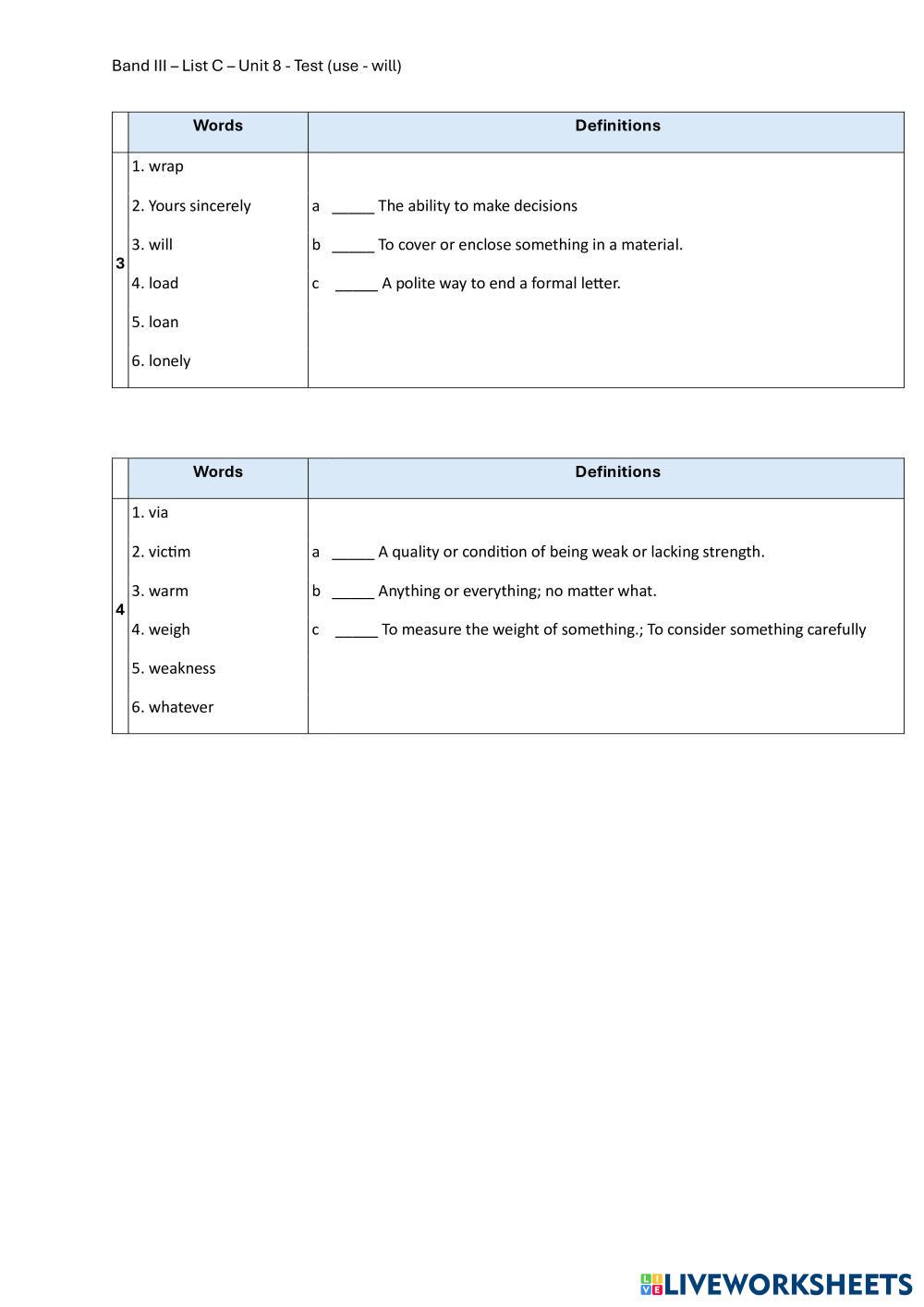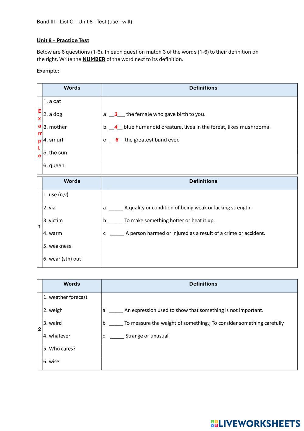 Created byEviatar Haim English Language High School 11th grade Vocabulary English Author's Instructions Complete the task My Google Classroom Courses × 0 classes selected (0 students total) Quick Access Select all classes (0 classes) All Classes Loading courses... Cancel Share Share to selected Course __COURSE_NAME__ __STUDENT_NAME__ (__STUDENT_EMAIL__) Band III – List C – Unit 8 - Test (use - will) Download Worksheet Validation Check my answers Emails my answers to my teacher Full name Group/level School subject Teacher's email or key code Close Submit Validating worksheet... (12) Your answers have been sent to your teacher. Good luck! OK We encountered an error submitting your answers. Please try again. OK Advertisement | Go Ad Free Created byEviatar Haim English Language High School 11th grade Vocabulary English Author's Instructions Complete the task Explore Worksheets Literatura renesance a humanismu English Language 11th grade Literatura renesance a humanismu Vocabulary - English Language Zopakujte si, co již víte o renesanci a humanismu Customer-Friendly Jargon for Contact Centers English Language 11th grade Customer-Friendly Jargon for Contact Centers Vocabulary - English Language Listen carefully to the phone call between the agent and the customer. Fill in the blanks with the correct phrases you hear. Do did for emphasis English Language 11th grade Do did for emphasis Vocabulary - English Language Choose the correct word Band III – List C – Unit 7 - Test (suffer from sth – union) English Language 11th grade Band III – List C – Unit 7 - Test (suffer from sth – union) Vocabulary - English Language Band III – List C – Unit 7 - Test (suffer from sth – union)