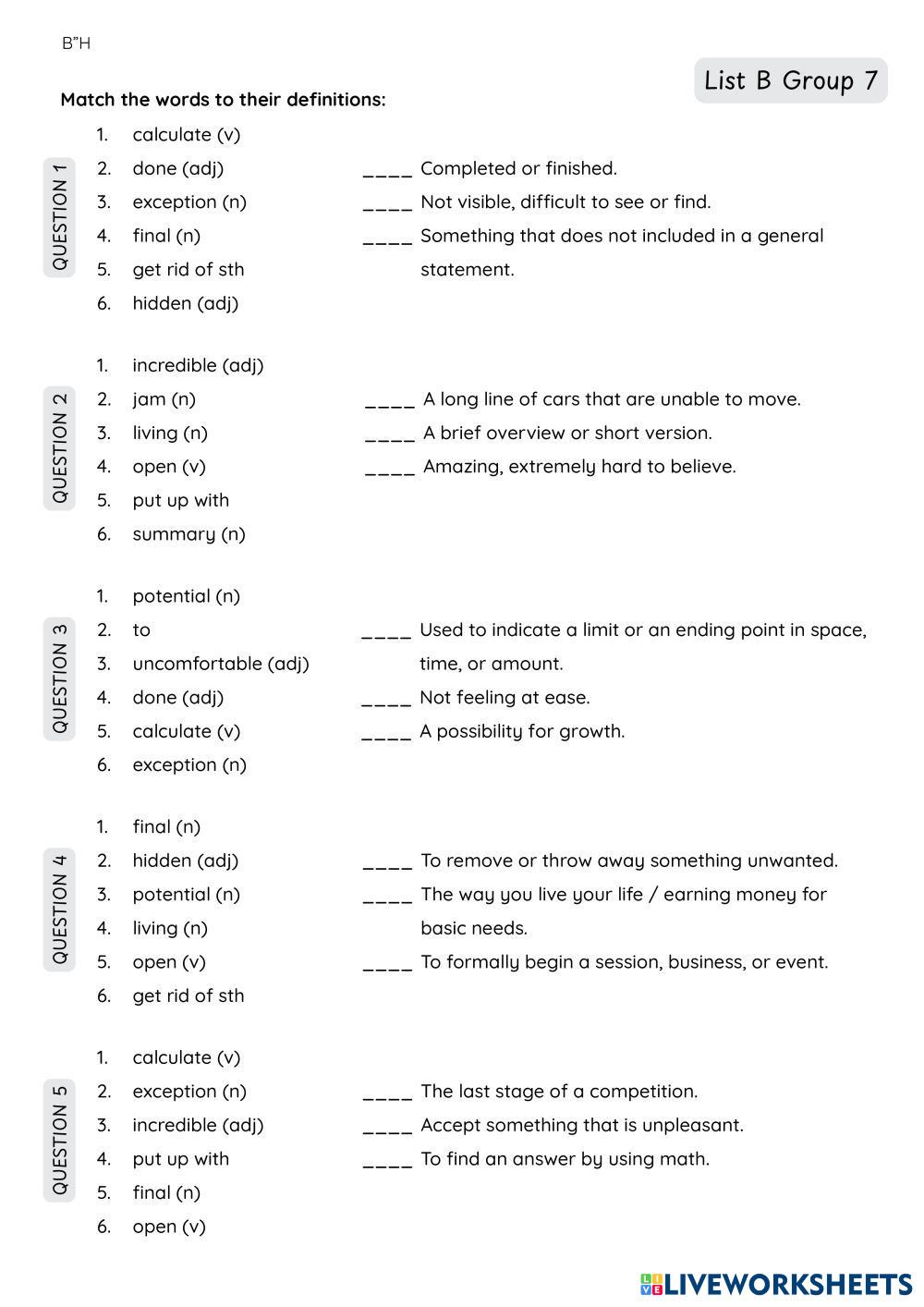 Created by Sharon770 English Language High School 10th grade Vocabulary English Author's Instructions LB G1 My Google Classroom Courses × 0 classes selected (0 students total) Quick Access Select all classes (0 classes) All Classes Loading courses... Cancel Share Share to selected Course __COURSE_NAME__ __STUDENT_NAME__ (__STUDENT_EMAIL__) LB G1 Download Worksheet Validation Check my answers Emails my answers to my teacher Full name Group/level School subject Teacher's email or key code Close Submit Validating worksheet... (12) Your answers have been sent to your teacher. Good luck! OK We encountered an error submitting your answers. Please try again. OK Advertisement | Go Ad Free Created by Sharon770 English Language High School 10th grade Vocabulary English Author's Instructions LB G1 Explore Worksheets Tiếng Anh 9 English Language 10th grade Tiếng Anh 9 Vocabulary - English Language Đề thi 10 Solutions pre 3A English Language 10th grade Solutions pre 3A Vocabulary - English Language films and TV shows Ergonomia English Language 10th grade Ergonomia Vocabulary - English Language Lee atentamente las preguntas y responde segun mas te parezca Past Simple Practice English Language 10th grade Past Simple Practice Vocabulary - English Language Put the verbs in the correct form: