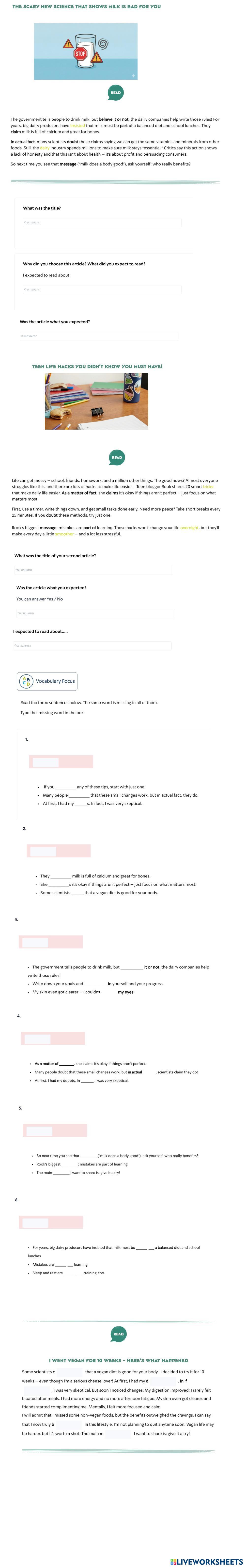 Created byאביעד ביטרן English Language High School 11th grade Vocabulary English Author's Instructions Do it My Google Classroom Courses × 0 classes selected (0 students total) Quick Access Select all classes (0 classes) All Classes Loading courses... Cancel Share Share to selected Course __COURSE_NAME__ __STUDENT_NAME__ (__STUDENT_EMAIL__) clickbait Download Worksheet Validation Check my answers Emails my answers to my teacher Full name Group/level School subject Teacher's email or key code Close Submit Validating worksheet... (12) Your answers have been sent to your teacher. Good luck! OK We encountered an error submitting your answers. Please try again. OK Advertisement | Go Ad Free Created byאביעד ביטרן English Language High School 11th grade Vocabulary English Author's Instructions Do it Explore Worksheets Practice 2 English Language 11th grade Practice 2 Vocabulary - English Language Read the text and find the words that has the definitions. Practice 1 English Language 11th grade Practice 1 Vocabulary - English Language write the word from the text النصوص متماسكة البنية English Language 11th grade النصوص متماسكة البنية Vocabulary - English Language اختر الإجابة الصحيحة من ضمن البدائل Banking English Language 11th grade Banking Vocabulary - English Language Complete the sentences with the words.