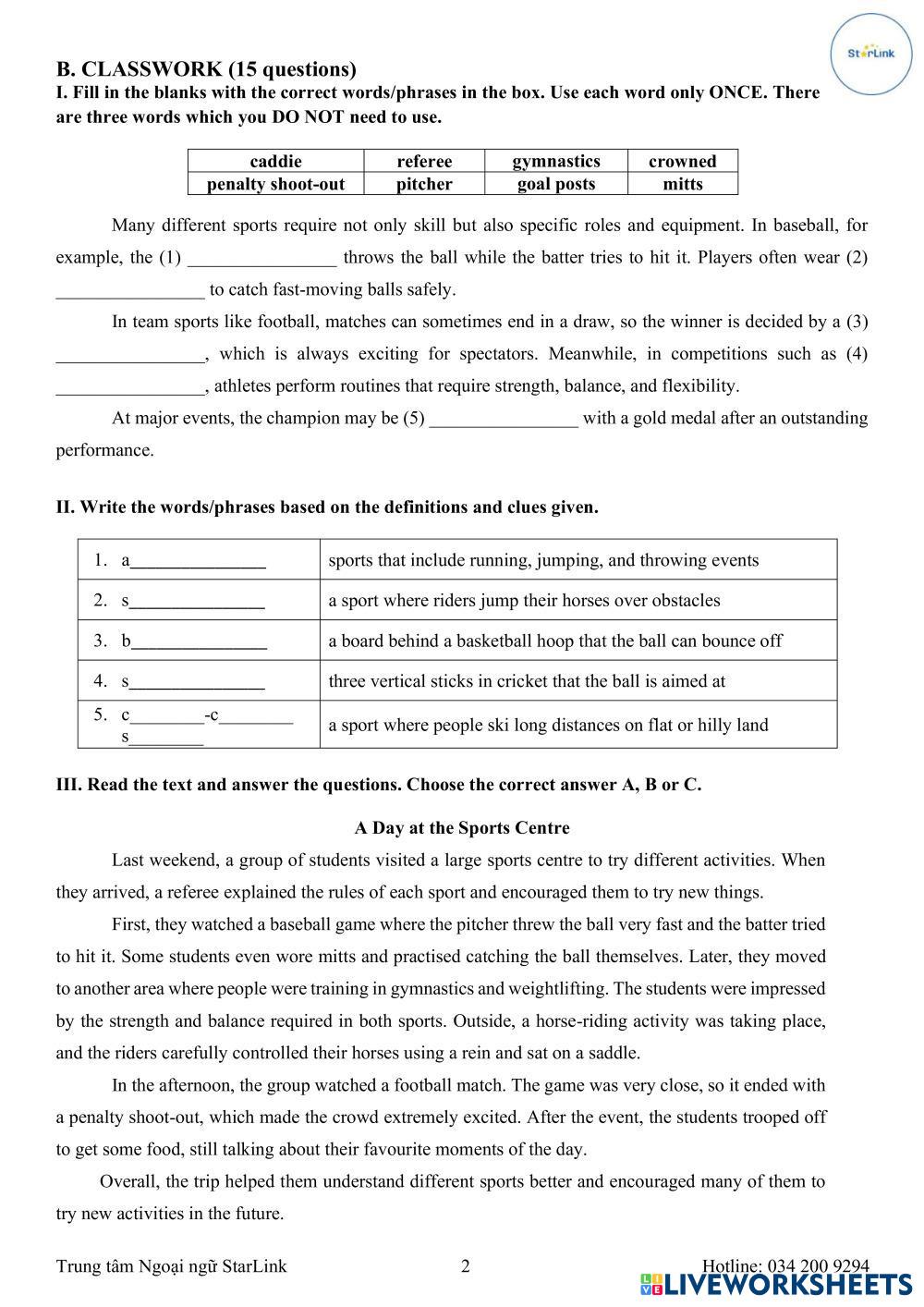 Created by GE7_MsChi English Language Middle School 7th grade Vocabulary English Author's Instructions Online_Foreign Teacher_S7_W30_U6_Vocabulary Revision My Google Classroom Courses × 0 classes selected (0 students total) Quick Access Select all classes (0 classes) All Classes Loading courses... Cancel Share Share to selected Course __COURSE_NAME__ __STUDENT_NAME__ (__STUDENT_EMAIL__) Online_Foreign Teacher_S7_W30_U6_Vocabulary Revision Download Worksheet Validation Check my answers Emails my answers to my teacher Full name Group/level School subject Teacher's email or key code Close Submit Validating worksheet... (12) Your answers have been sent to your teacher. Good luck! OK We encountered an error submitting your answers. Please try again. OK Advertisement | Go Ad Free Created by GE7_MsChi English Language Middle School 7th grade Vocabulary English Author's Instructions Online_Foreign Teacher_S7_W30_U6_Vocabulary Revision Explore Worksheets Teamwork - WB - pages 74-75 English Language 7th grade Teamwork - WB - pages 74-75 Vocabulary - English Language Complete the tasks. Teamwork Workbook p.67-68 English Language 7th grade Teamwork Workbook p.67-68 Vocabulary - English Language Read instructions and do the tasks. How we spend our time English Language 7th grade How we spend our time Vocabulary - English Language Match the word with the correct difinition How we spend our time English Language 7th grade How we spend our time Vocabulary - English Language Match the word with the correct difinition