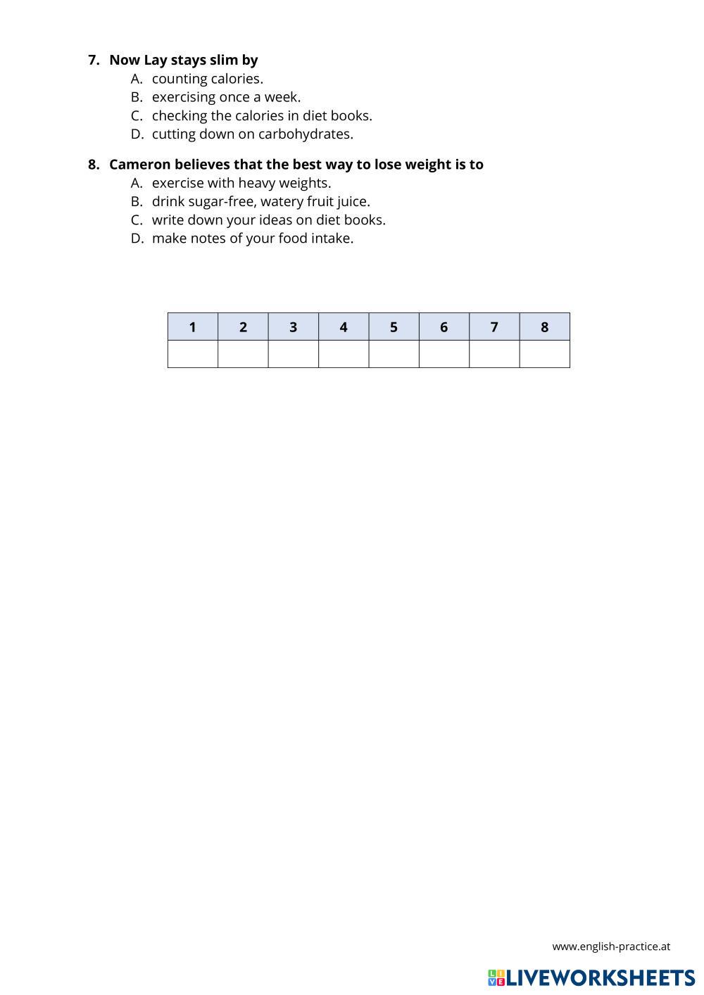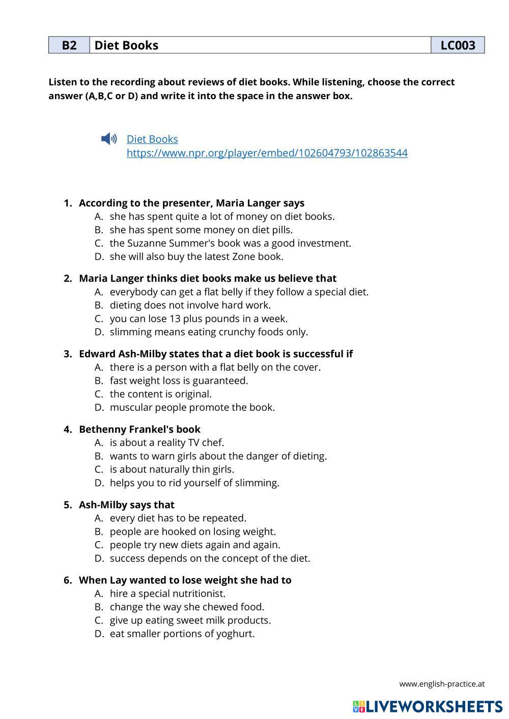 Created byMilda English Language High School 11th grade Vocabulary English Author's Instructions ---- My Google Classroom Courses × 0 classes selected (0 students total) Quick Access Select all classes (0 classes) All Classes Loading courses... Cancel Share Share to selected Course __COURSE_NAME__ __STUDENT_NAME__ (__STUDENT_EMAIL__) Diet book B2+ Listening Download Worksheet Validation Check my answers Emails my answers to my teacher Full name Group/level School subject Teacher's email or key code Close Submit Validating worksheet... (12) Your answers have been sent to your teacher. Good luck! OK We encountered an error submitting your answers. Please try again. OK Advertisement | Go Ad Free Created byMilda English Language High School 11th grade Vocabulary English Author's Instructions ---- Explore Worksheets Wishes and regrets English Language 11th grade Wishes and regrets Vocabulary - English Language Choose the correct option Match Vocabs and meanings English Language 11th grade Match Vocabs and meanings Vocabulary - English Language Complete high note 3 - 8B/C - words3 English Language 11th grade high note 3 - 8B/C - words3 Vocabulary - English Language Follow the instructions in the tasks. high note 3 - 8B/C - words2 English Language 11th grade high note 3 - 8B/C - words2 Vocabulary - English Language Follow the tasks.