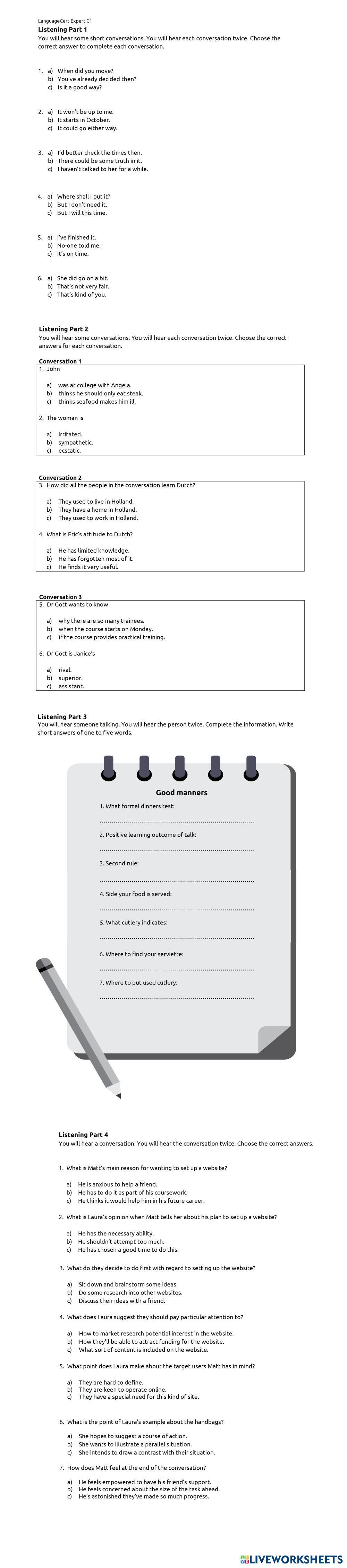 Created byRosario Pullano English Language Middle School 7th grade Vocabulary English Author's Instructions C1 My Google Classroom Courses × 0 classes selected (0 students total) Quick Access Select all classes (0 classes) All Classes Loading courses... Cancel Share Share to selected Course __COURSE_NAME__ __STUDENT_NAME__ (__STUDENT_EMAIL__) C1LsteningPaper3 Download Worksheet Validation Check my answers Emails my answers to my teacher Full name Group/level School subject Teacher's email or key code Close Submit Validating worksheet... (12) Your answers have been sent to your teacher. Good luck! OK We encountered an error submitting your answers. Please try again. OK Advertisement | Go Ad Free Created byRosario Pullano English Language Middle School 7th grade Vocabulary English Author's Instructions C1 Explore Worksheets Magui's homework English Language 7th grade Magui's homework Vocabulary - English Language Homework Magui's homework English Language 7th grade Magui's homework Vocabulary - English Language Homework Giving direction (listening task) English Language 7th grade Giving direction (listening task) Vocabulary - English Language Listen to the audio and name the destination Early Explorers - Vocabulary Worksheet English Language 7th grade Early Explorers - Vocabulary Worksheet Vocabulary - English Language Read the questions carefully, then answer.