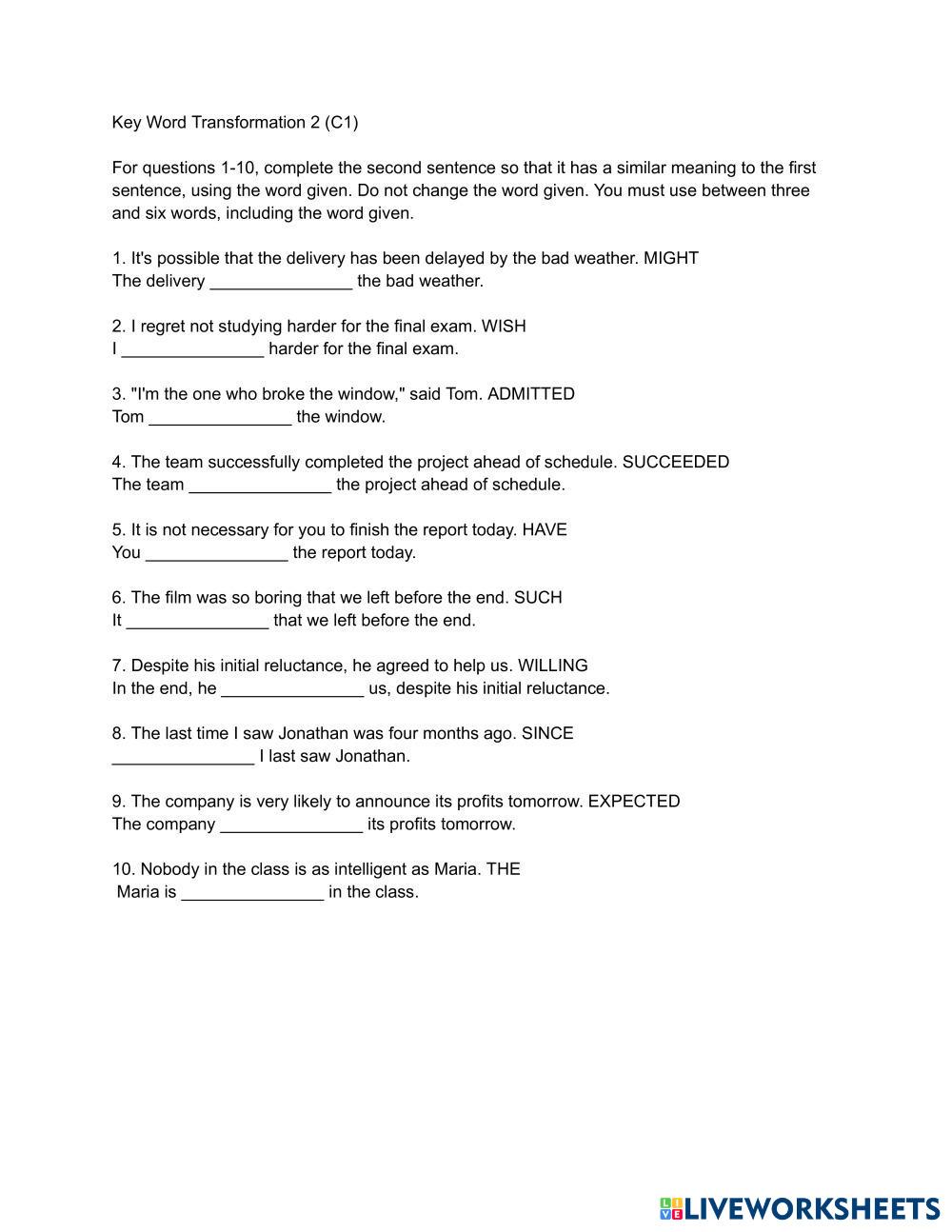 For questions 1-10, complete the second sentence so that it has a similar meaning to the first sentence, using the word given. Do not change the word given. You must use between three and six words, including the word given.