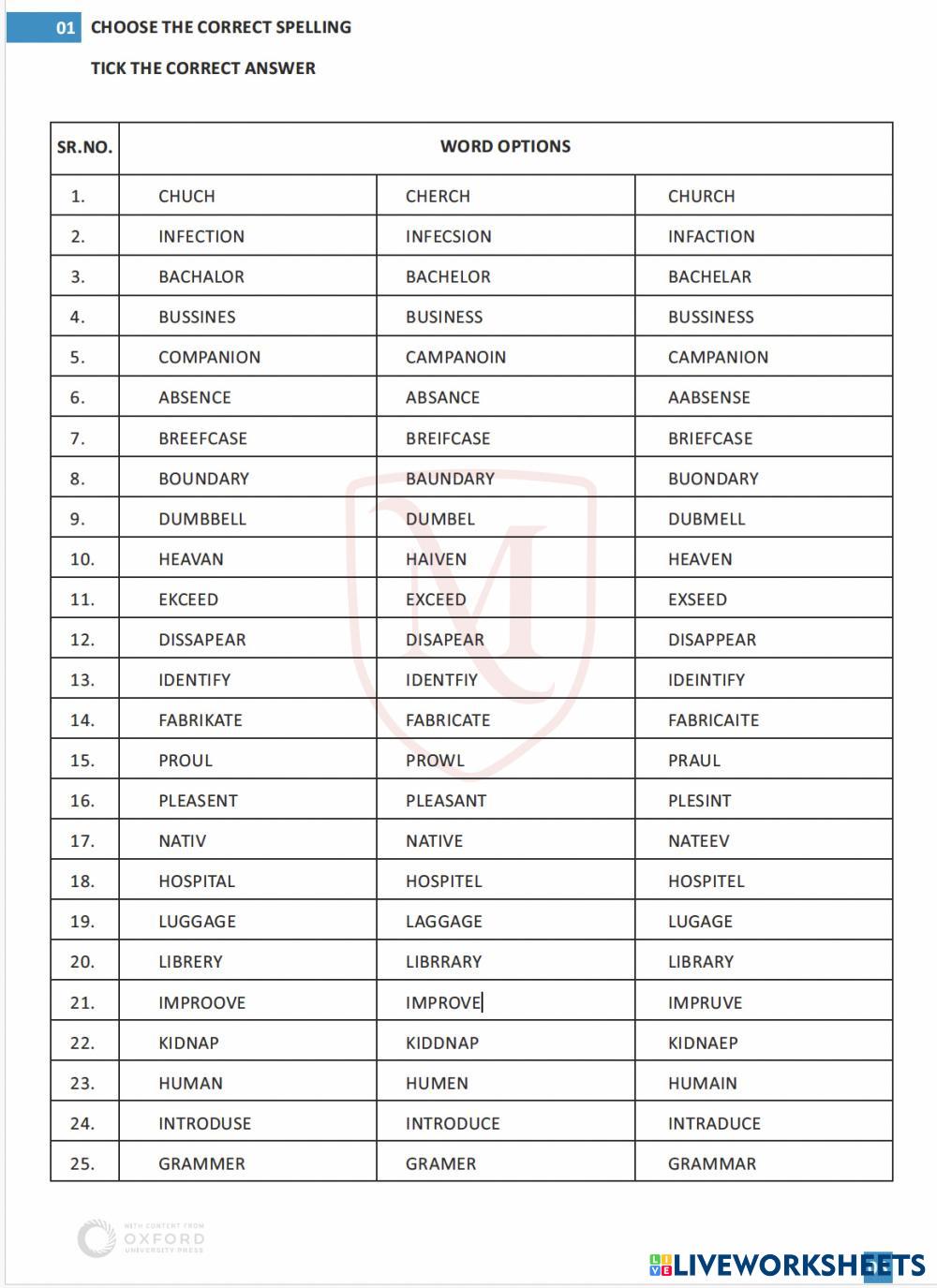 Created by Uthayak31 English Language Elementary 3rd grade Writing English Author's Instructions Tick the correct spelling My Google Classroom Courses × 0 classes selected (0 students total) Quick Access Select all classes (0 classes) All Classes Loading courses... Cancel Share Share to selected Course __COURSE_NAME__ __STUDENT_NAME__ (__STUDENT_EMAIL__) Choose the correct spelling - 1 Download Worksheet Validation Check my answers Emails my answers to my teacher Full name Group/level School subject Teacher's email or key code Close Submit Validating worksheet... (12) Your answers have been sent to your teacher. Good luck! OK We encountered an error submitting your answers. Please try again. OK Advertisement | Go Ad Free Created by Uthayak31 English Language Elementary 3rd grade Writing English Author's Instructions Tick the correct spelling Explore Worksheets Hard and Soft C English Language 3rd grade Hard and Soft C Writing - English Language Identify hard and soft C sounds in words. Then, use them in sentences or dialogues. fun day English Language 3rd grade fun day Writing - English Language write about a bee in a hat Numbers 0-12 and phone numbers English Language 3rd grade Numbers 0-12 and phone numbers Writing - English Language 1. Write the numbers 2. Fill in the gaps Countries in English English Language 3rd grade Countries in English Writing - English Language Write the names of the countries, focussing on the hints. Pay attention to the maps.
