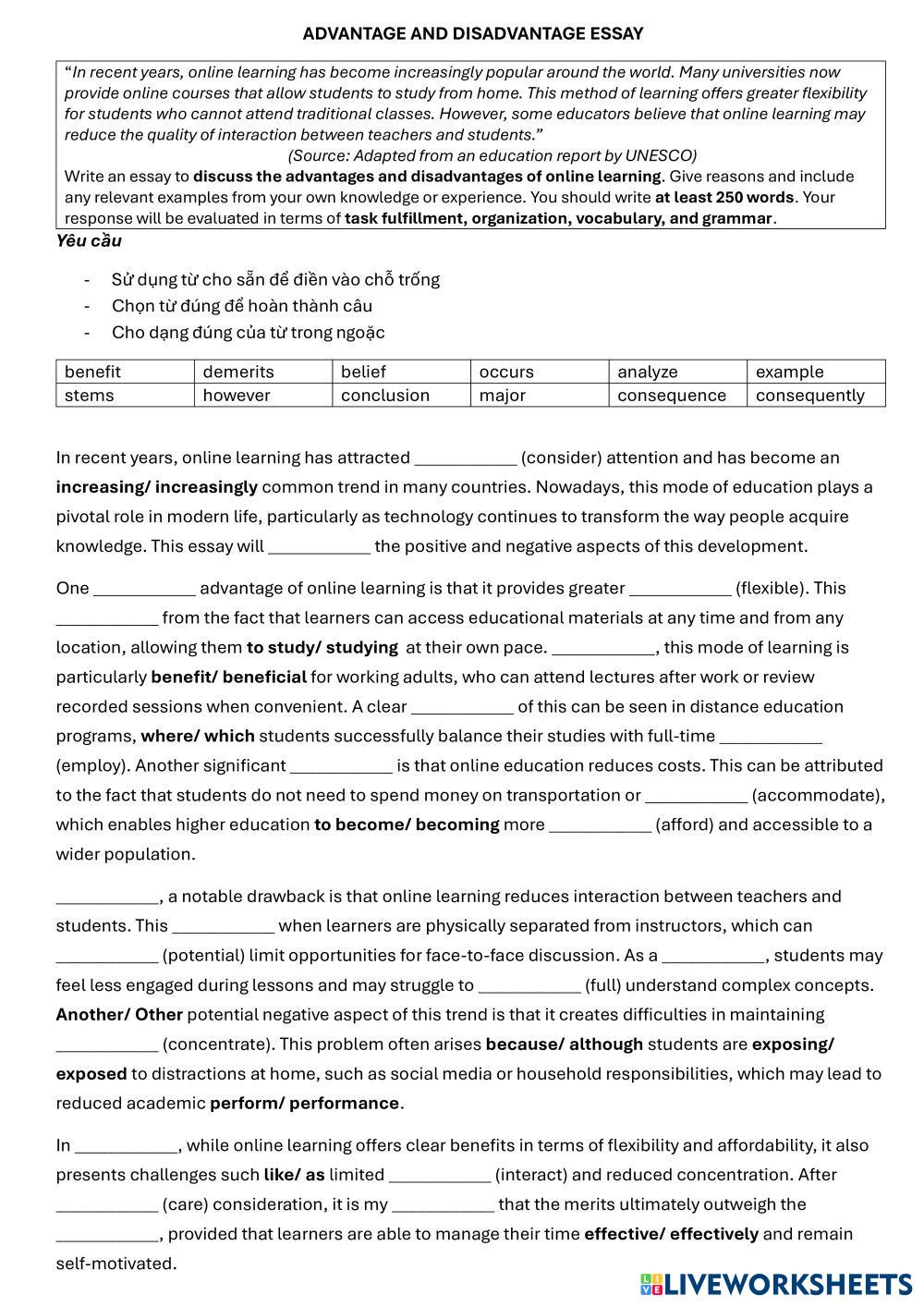Created byToàn Triệu Khánh English Language High School 12th grade Writing English Author's Instructions Writing practice My Google Classroom Courses × 0 classes selected (0 students total) Quick Access Select all classes (0 classes) All Classes Loading courses... Cancel Share Share to selected Course __COURSE_NAME__ __STUDENT_NAME__ (__STUDENT_EMAIL__) ADVANTAGE AND DISADVANTGE ESSAY Download Worksheet Validation Check my answers Emails my answers to my teacher Full name Group/level School subject Teacher's email or key code Close Submit Validating worksheet... (12) Your answers have been sent to your teacher. Good luck! OK We encountered an error submitting your answers. Please try again. OK Advertisement | Go Ad Free Created byToàn Triệu Khánh English Language High School 12th grade Writing English Author's Instructions Writing practice Explore Worksheets Conditionals I English Language 12th grade Conditionals I Writing - English Language Complete with conditional All Tenses English Language 12th grade All Tenses Writing - English Language fill the gaps Postcard from New York English Language 12th grade Postcard from New York Writing - English Language Complete the exercise. A postcard from New York English Language 12th grade A postcard from New York Writing - English Language https://learnenglishteens.britishcouncil.org/sites/teens/files/a_postcard_from_new_york_-_exercises_4.pdf