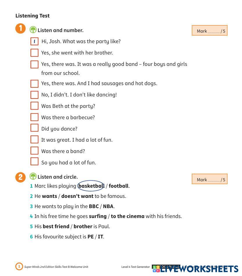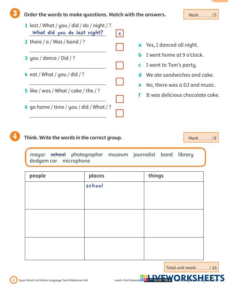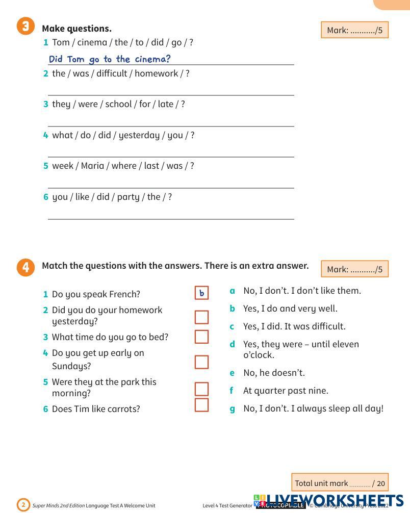 Created by alonatimchenko English Language Elementary 5th grade Writing English Author's Instructions Do exercises My Google Classroom Courses × 0 classes selected (0 students total) Quick Access Select all classes (0 classes) All Classes Loading courses... Cancel Share Share to selected Course __COURSE_NAME__ __STUDENT_NAME__ (__STUDENT_EMAIL__) Super minds 4 Test Unit 0 Download Worksheet Validation Check my answers Emails my answers to my teacher Full name Group/level School subject Teacher's email or key code Close Submit Validating worksheet... (12) Your answers have been sent to your teacher. Good luck! OK We encountered an error submitting your answers. Please try again. OK Advertisement | Go Ad Free Created by alonatimchenko English Language Elementary 5th grade Writing English Author's Instructions Do exercises Explore Worksheets TEST 1 - KHỐI 5 English Language 5th grade TEST 1 - KHỐI 5 Writing - English Language Các bạn đọc kĩ đề và làm đi làm lại nhiều lần để nhớ kiến thức uyuyu English Language 5th grade uyuyu Writing - English Language Uyuyyu Test English Language 5th grade Test Writing - English Language do the test Sentence Function #1 English Language 5th grade Sentence Function #1 Writing - English Language Please read the instructions and do the worksheet.