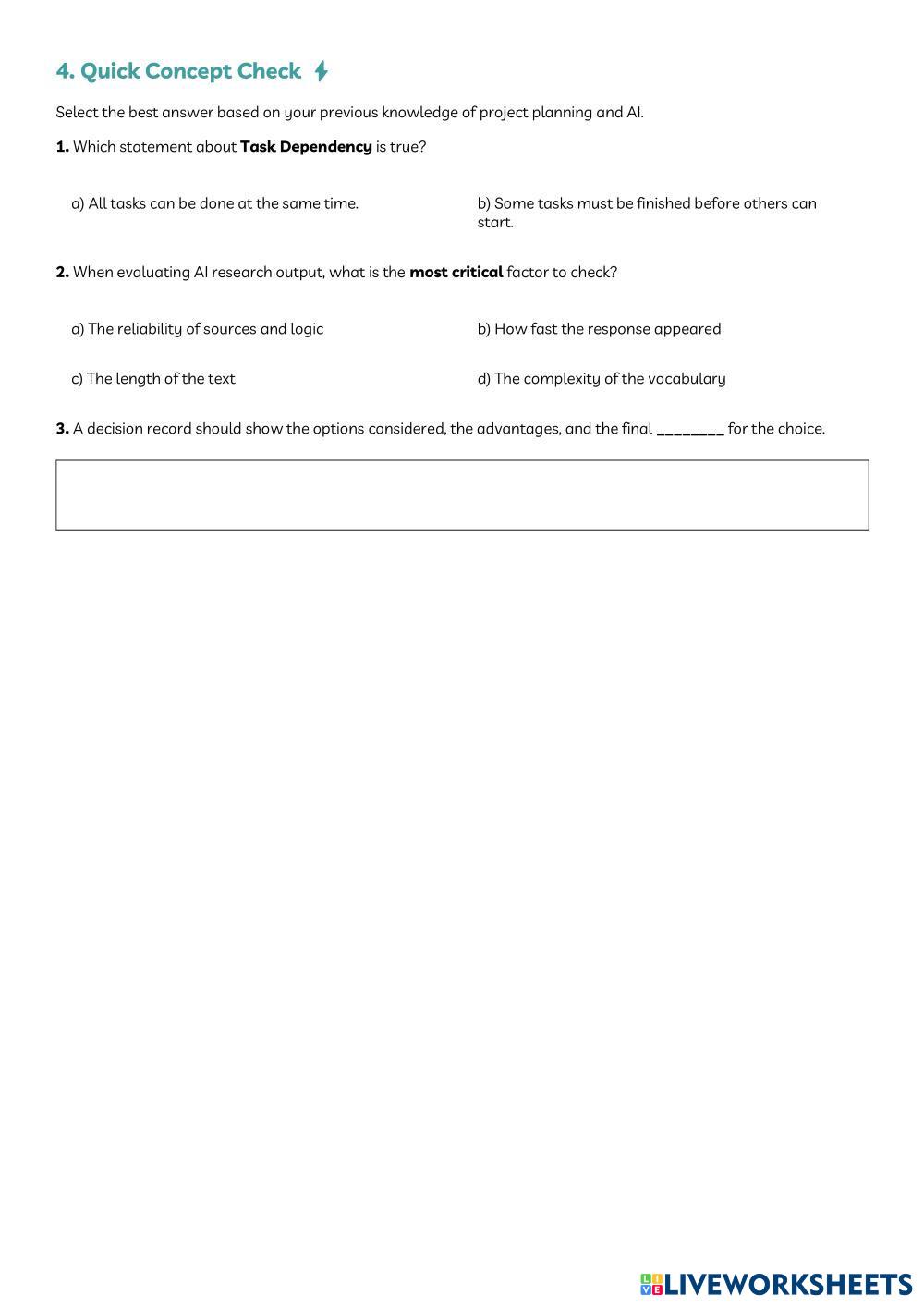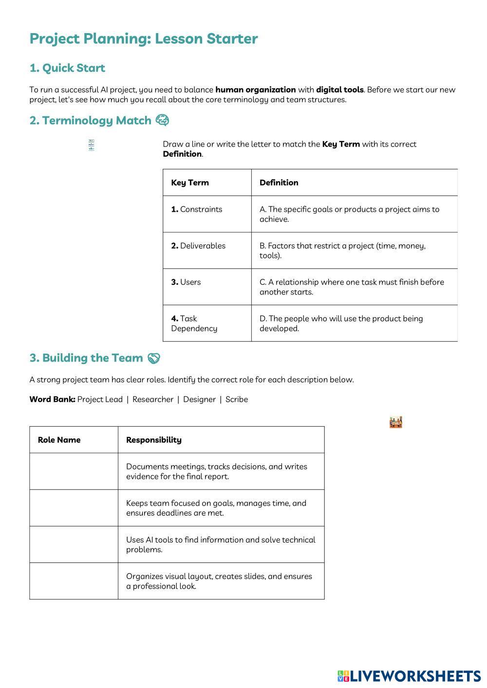 Created byAbhay Sebastian Saj English Language High School 12th grade Writing English Author's Instructions Fill in the blanks My Google Classroom Courses × 0 classes selected (0 students total) Quick Access Select all classes (0 classes) All Classes Loading courses... Cancel Share Share to selected Course __COURSE_NAME__ __STUDENT_NAME__ (__STUDENT_EMAIL__) Project Planning Download Worksheet Validation Check my answers Emails my answers to my teacher Full name Group/level School subject Teacher's email or key code Close Submit Validating worksheet... (12) Your answers have been sent to your teacher. Good luck! OK We encountered an error submitting your answers. Please try again. OK Advertisement | Go Ad Free Created byAbhay Sebastian Saj English Language High School 12th grade Writing English Author's Instructions Fill in the blanks Explore Worksheets EXAMEN DE LITERATURA 4 English Language 12th grade EXAMEN DE LITERATURA 4 Writing - English Language EXAMEN DE LITERATURA CUARTO BACHILLERATO EXAMEN DE LITERATURA 4 English Language 12th grade EXAMEN DE LITERATURA 4 Writing - English Language Examen de literatura de cuarto bachillerato 1ra. unidad 2026 present simple English Language 12th grade present simple Writing - English Language Check the sentences and find the mistakes. BR B2 U8 Business Communication English Language 12th grade BR B2 U8 Business Communication Writing - English Language Put the words in the correct order