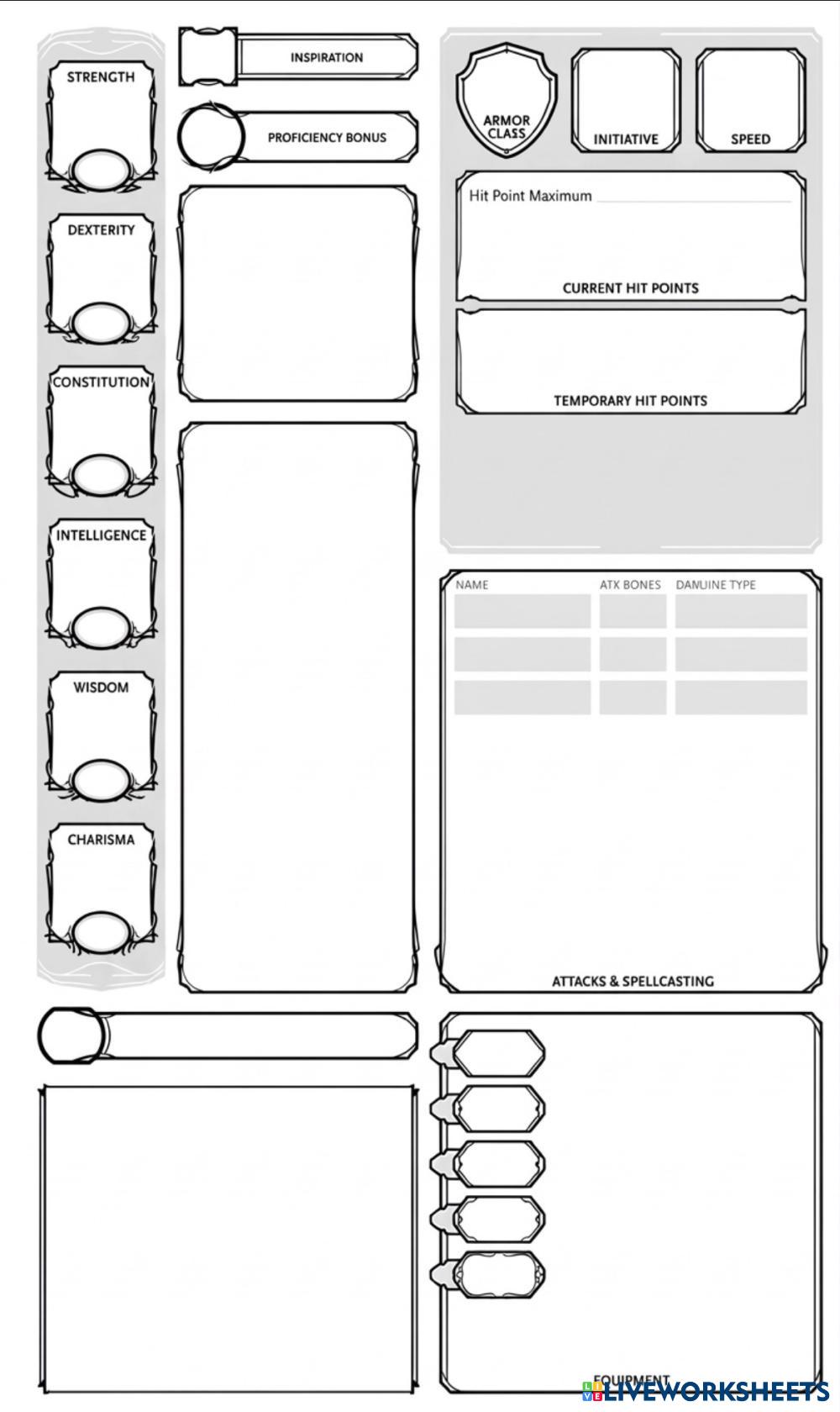 Complete the table with your created character’s information. NOTE: This stat sheet is different from a standard DND sheet and is only intended to be used during the Quest to Level 5 during the Gathering.