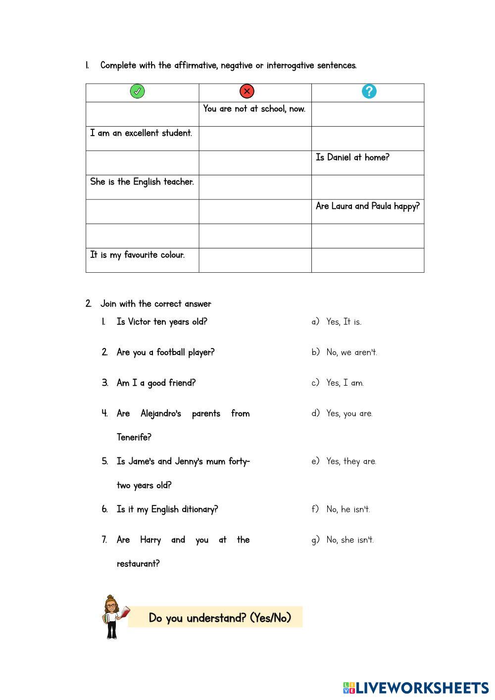 Created byAni teacher English language Verb TO BE Age 10-9 level: 6TH PE English Author's Instructions My Google Classroom Courses × 0 classes selected (0 students total) Quick Access Select all classes (0 classes) All Classes Loading courses... Cancel Share Share to selected Course __COURSE_NAME__ __STUDENT_NAME__ (__STUDENT_EMAIL__) VERB TO BE Download Worksheet Validation Check my answers Emails my answers to my teacher Full name Group/level School subject Teacher's email or key code Close Submit Validating worksheet... (12) Your answers have been sent to your teacher. Good luck! OK We encountered an error submitting your answers. Please try again. OK Advertisement | Go Ad Free Created byAni teacher English language Verb TO BE Age 10-9 level: 6TH PE English Author's Instructions