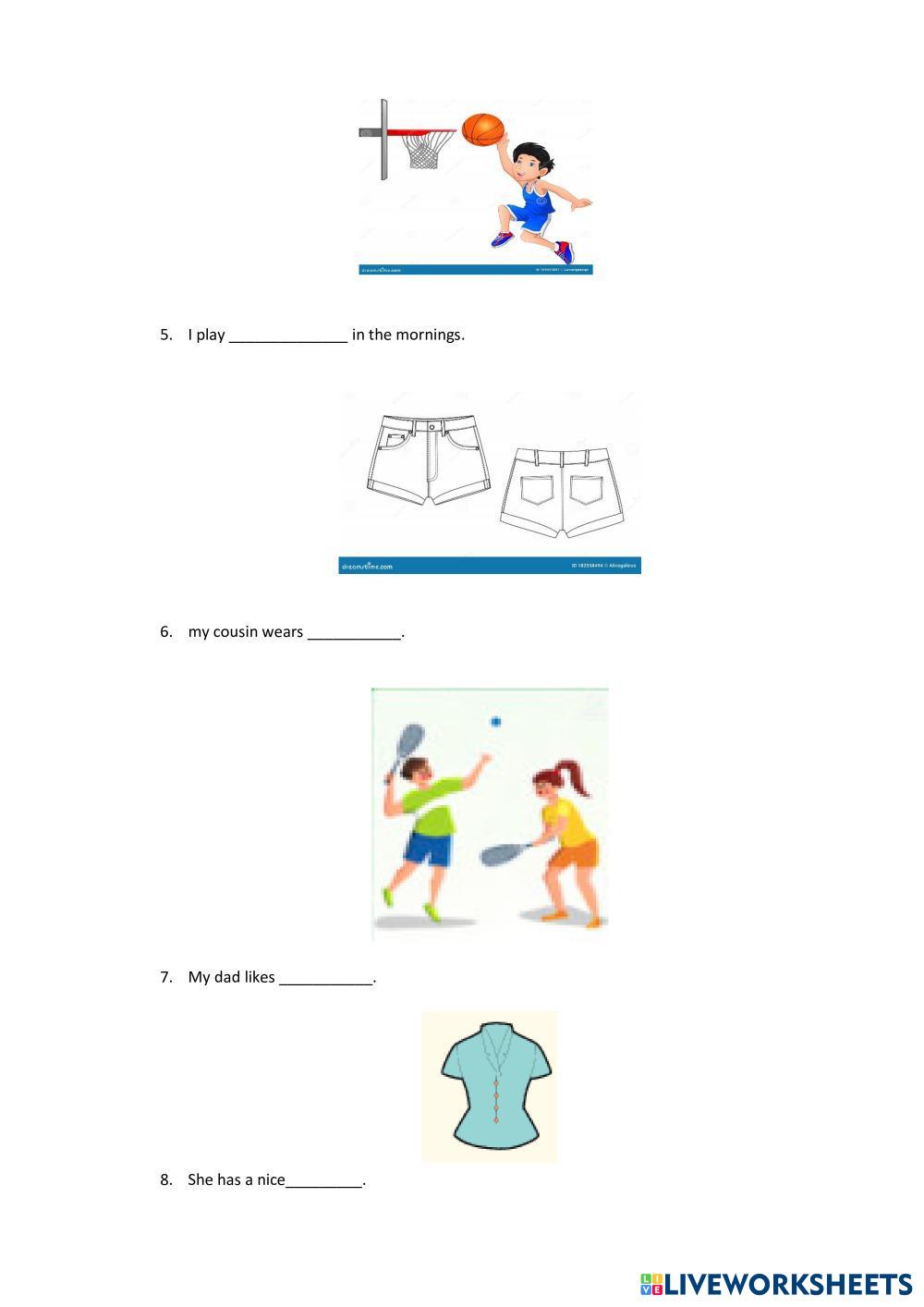 Created byLuz Otero English language English Age 8+ level: primaria English Author's Instructions My Google Classroom Courses × 0 classes selected (0 students total) Quick Access Select all classes (0 classes) All Classes Loading courses... Cancel Share Share to selected Course __COURSE_NAME__ __STUDENT_NAME__ (__STUDENT_EMAIL__) Clothing and Sports Download Worksheet Validation Check my answers Emails my answers to my teacher Full name Group/level School subject Teacher's email or key code Close Submit Validating worksheet... (12) Your answers have been sent to your teacher. Good luck! OK We encountered an error submitting your answers. Please try again. OK Advertisement | Go Ad Free Created byLuz Otero English language English Age 8+ level: primaria English Author's Instructions