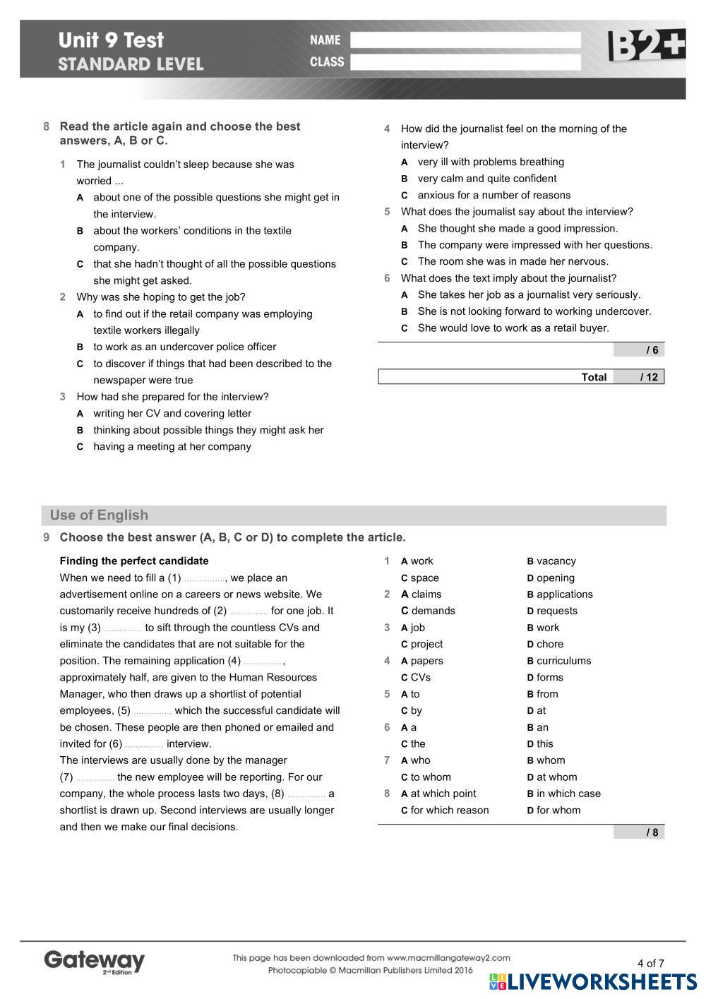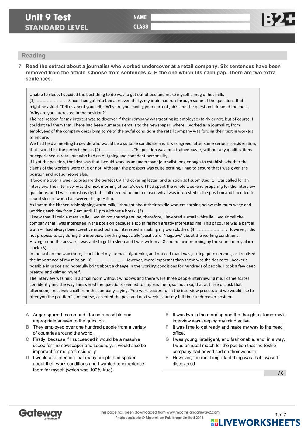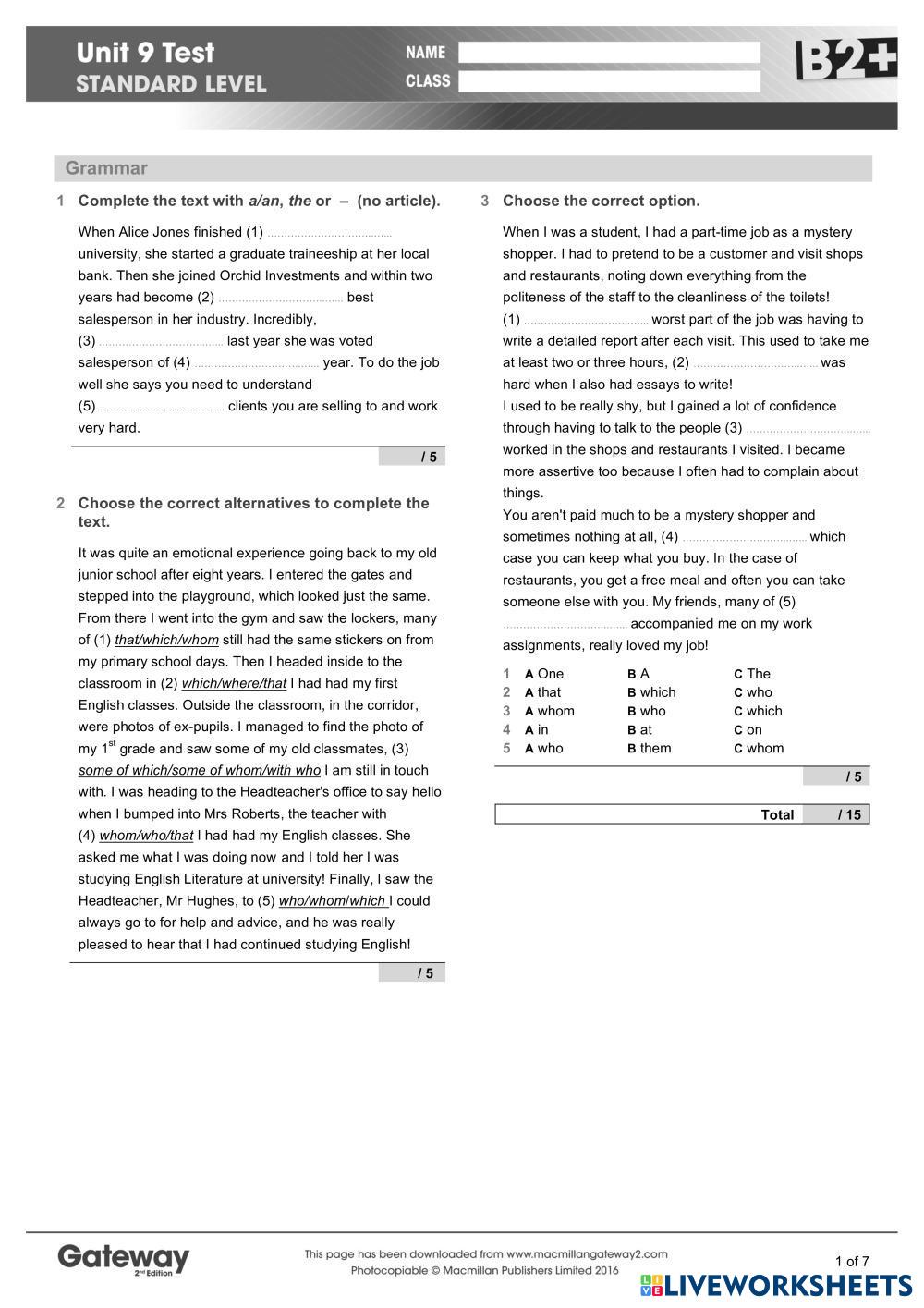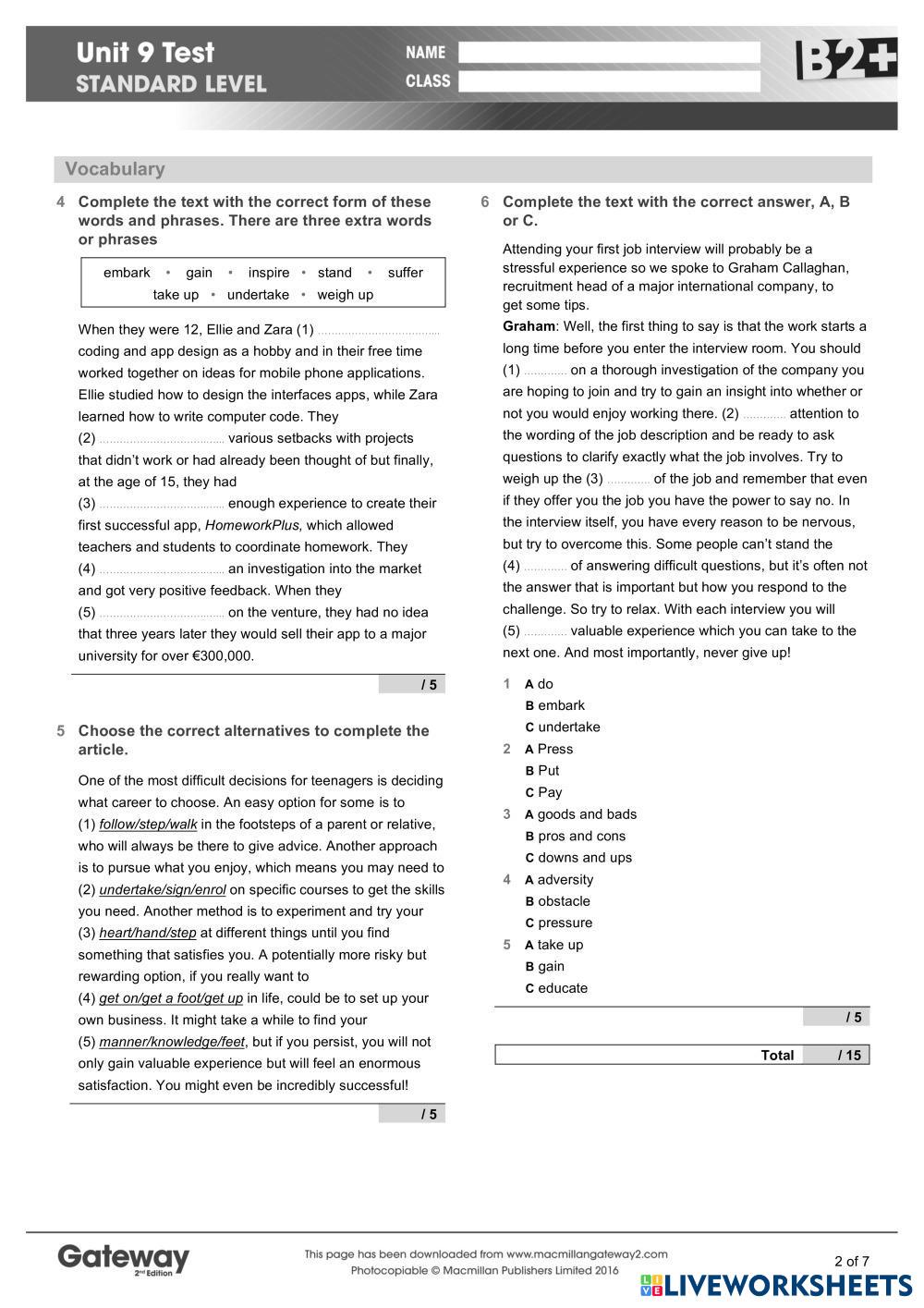 Created by incolink English as a Second Language (ESL) Tests Age 13+ level: B2+ Russian Author's Instructions My Google Classroom Courses × 0 classes selected (0 students total) Quick Access Select all classes (0 classes) All Classes Loading courses... Cancel Share Share to selected Course __COURSE_NAME__ __STUDENT_NAME__ (__STUDENT_EMAIL__) Gateway B2+ Unit 9 Test Download Worksheet Validation Check my answers Emails my answers to my teacher Full name Group/level School subject Teacher's email or key code Close Submit Validating worksheet... (12) Your answers have been sent to your teacher. Good luck! OK We encountered an error submitting your answers. Please try again. OK Advertisement | Go Ad Free Created by incolink English as a Second Language (ESL) Tests Age 13+ level: B2+ Russian Author's Instructions