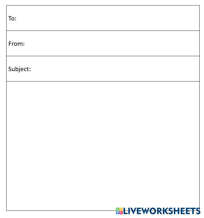 Created byAMIRAH BINTI MOHAMAD SALIM English language Email Writing Template Age 10-15 level: KS2 English Author's Instructions My Google Classroom Courses × 0 classes selected (0 students total) Quick Access Select all classes (0 classes) All Classes Loading courses... Cancel Share Share to selected Course __COURSE_NAME__ __STUDENT_NAME__ (__STUDENT_EMAIL__) Email Writing Download Worksheet Validation Check my answers Emails my answers to my teacher Full name Group/level School subject Teacher's email or key code Close Submit Validating worksheet... (12) Your answers have been sent to your teacher. Good luck! OK We encountered an error submitting your answers. Please try again. OK Advertisement | Go Ad Free Created byAMIRAH BINTI MOHAMAD SALIM English language Email Writing Template Age 10-15 level: KS2 English Author's Instructions