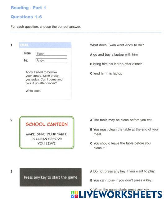 Created by yennhi3012 English language A2 Age 11-15 level: A2 English Author's Instructions My Google Classroom Courses × 0 classes selected (0 students total) Quick Access Select all classes (0 classes) All Classes Loading courses... Cancel Share Share to selected Course __COURSE_NAME__ __STUDENT_NAME__ (__STUDENT_EMAIL__) Practice Test KET – Test 2 Download Worksheet Validation Check my answers Emails my answers to my teacher Full name Group/level School subject Teacher's email or key code Close Submit Validating worksheet... (12) Your answers have been sent to your teacher. Good luck! OK We encountered an error submitting your answers. Please try again. OK Advertisement | Go Ad Free Created by yennhi3012 English language A2 Age 11-15 level: A2 English Author's Instructions